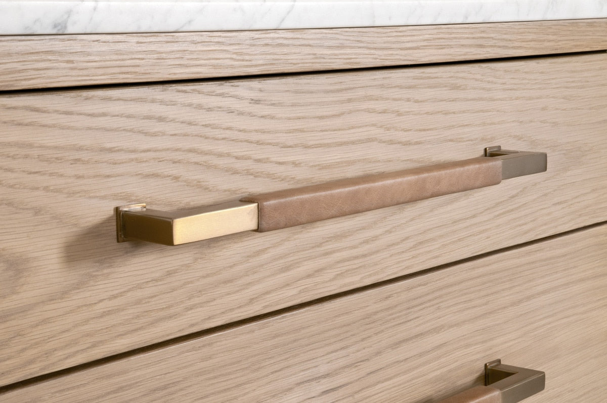 The Cambria 8-Drawer Dresser expertly balances style and practicality, making it an ideal addition to any bedroom. Crafted from solid oak wood and oak veneer, it features a warm natural oak finish that complements a variety of interiors. The elegant marble top, with its subtle white and gray veining, adds a refined touch of luxury. Designed with eight spacious drawers, including felt-lined top drawers for delicate items, it provides generous storage options. Each drawer operates smoothly on dual metal glides, while aged brass handles wrapped in leather enhance its sophisticated appeal. Supported by sturdy KD legs, the dresser ensures lasting stability. Combining traditional craftsmanship with contemporary details, the Cambria dresser serves as both a functional storage solution and a stylish focal point, elevating your living space with timeless elegance.
