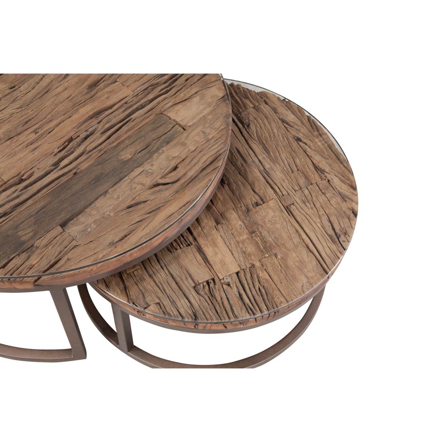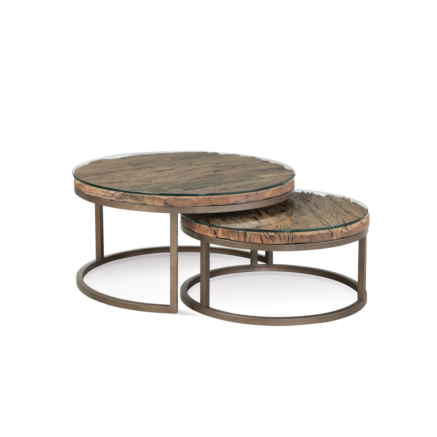 The Cambria Nesting Tables feature a heavily weathered reclaimed wood top and a metal open frame base design. A glass top accompanies this piece for protection and aesthetics. Finish: hand padded bronze. Material: metal, reclaimed wood. Reclaimed wood is subject to natural variations in characteristics.