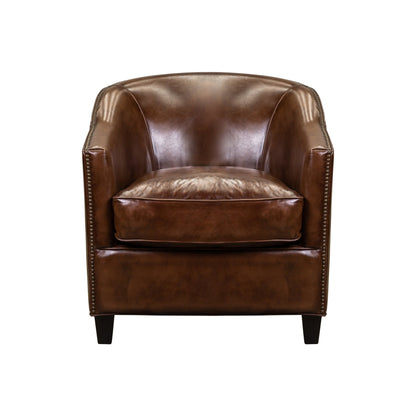 The Camilla Chair in Richmond Saddle is a blend of comfort and style, perfect for any living space. Crafted from high-quality leather, this chair offers a warm and inviting look with its rich Richmond Saddle finish. The barrel shape adds a touch of elegance, while the antique brass nail trim brings a classic charm. This chair is ideal for both lounging and entertaining, making it a versatile addition to your home.