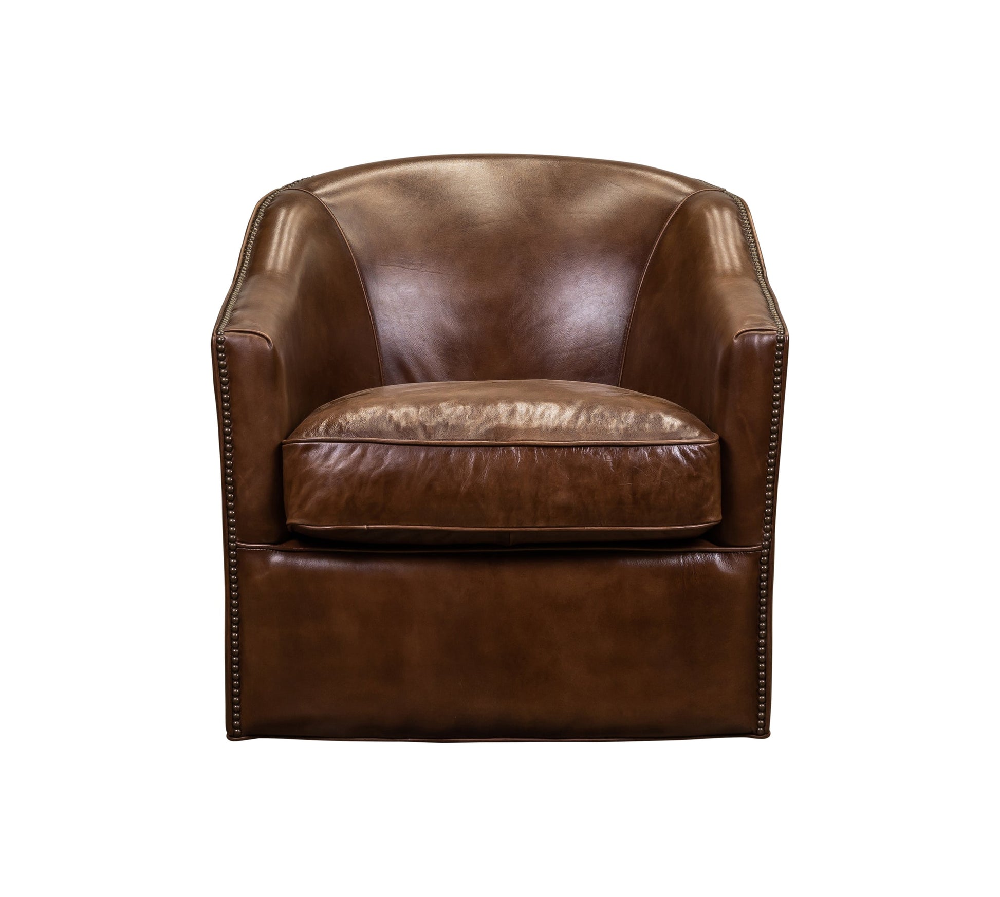The Camilla Swivel Chair is a cozy addition to any room, offering both comfort and style. With its barrel shape and rich Richmond Saddle finish, this chair is a perfect fit for those who appreciate fine details. The antique brass nails add a touch of elegance, while the smooth leather finish enhances its classic look. This chair is designed to provide a comfortable seating experience, making it ideal for watching your favorite shows or having conversations with friends.