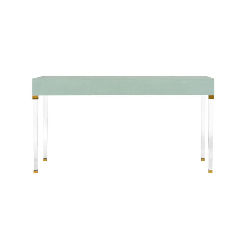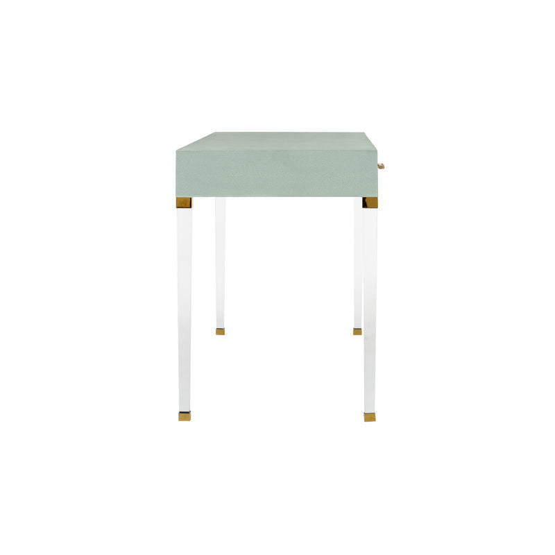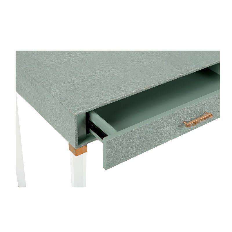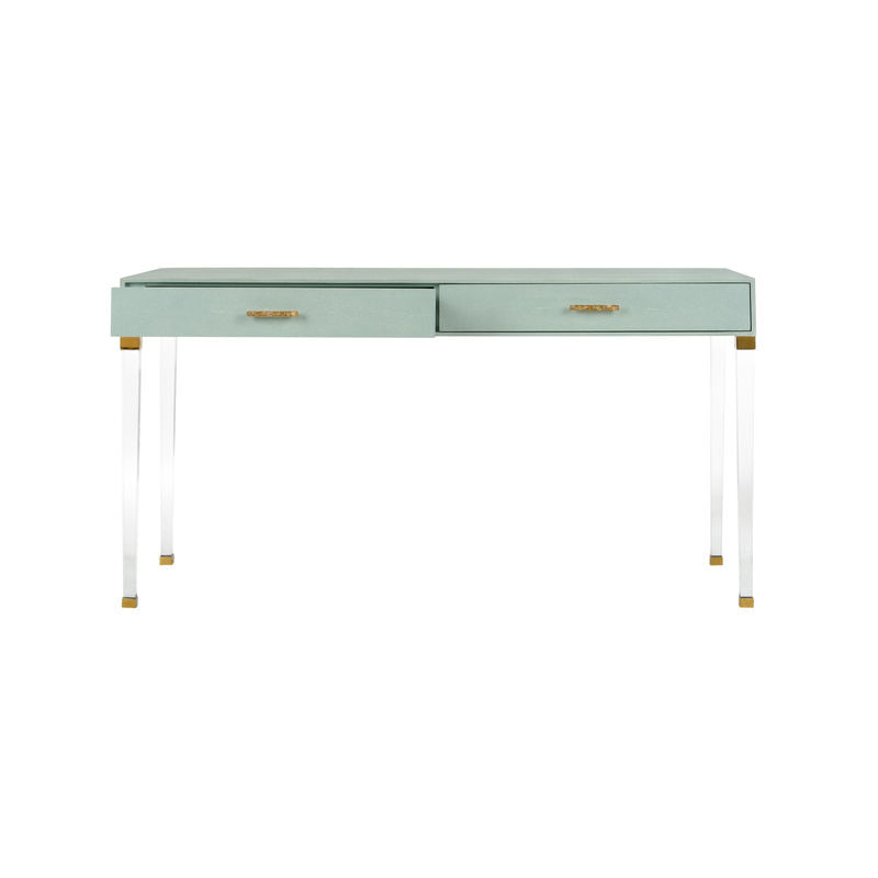 The Camilla Desk is a perfect blend of classic and modern design elements. Inspired by neoclassic shapes, it stands out with its contemporary details that add flair to any room. The desk is hand-wrapped in a light Grey/green faux shagreen, giving it a unique texture and appearance. This stylish finish harmonizes beautifully with the modern aesthetics of the piece. Designed by Shayla Copas, this desk is both functional and a statement piece, making it an excellent addition to any home or office space. The desk's standout features include its acrylic legs, which offer a sleek and airy feel. The transparency of the legs enhances the room's lightness, creating an illusion of more space.