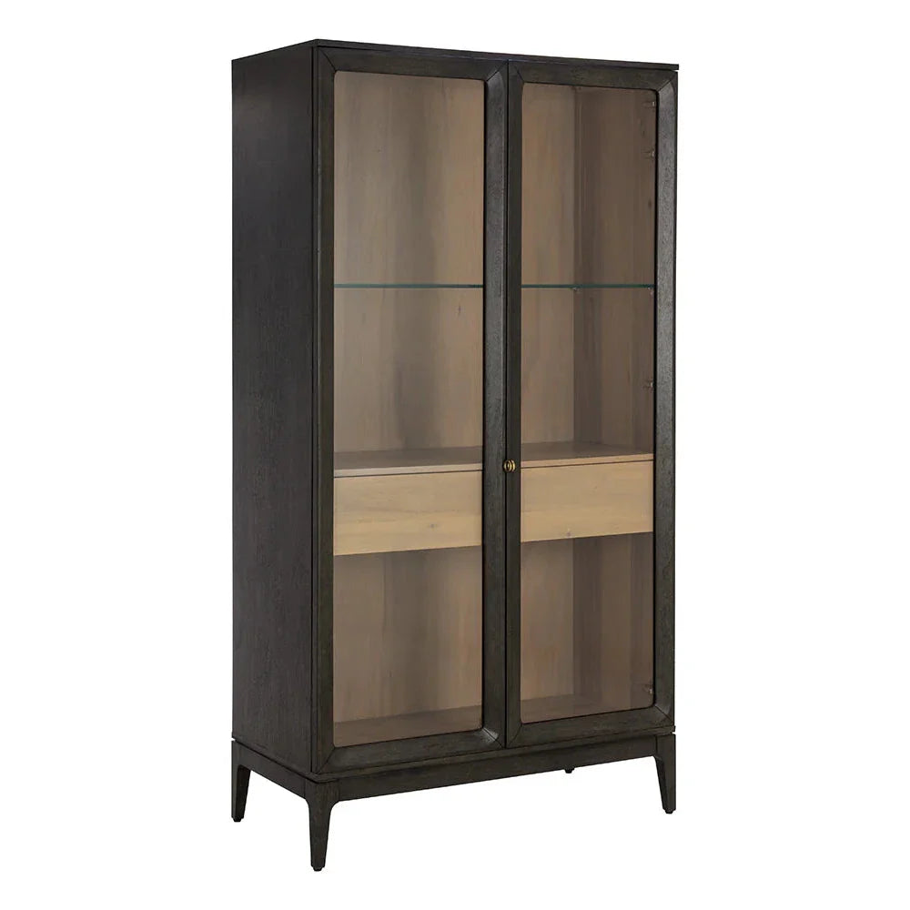 Simple and sophisticated, the Cecilia Display Cabinet features a mid-century design with understated details. Crafted with a smoked grey acacia veneer base and clear tempered glass doors, this cabinet adds a touch of elegance to any room. The solid rubberwood legs provide sturdy support, while brass handles complete the stylish look. As wood is an organic, porous material, each piece will show natural variations in texture, color, and grain. These may include fine indentations, cracks, and visible knots and burls that add to the unique character of each cabinet.