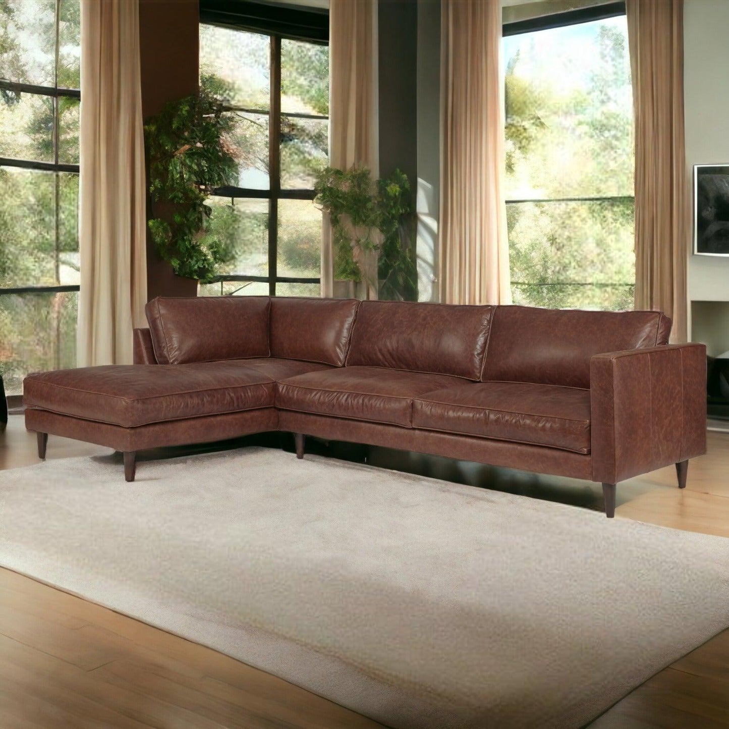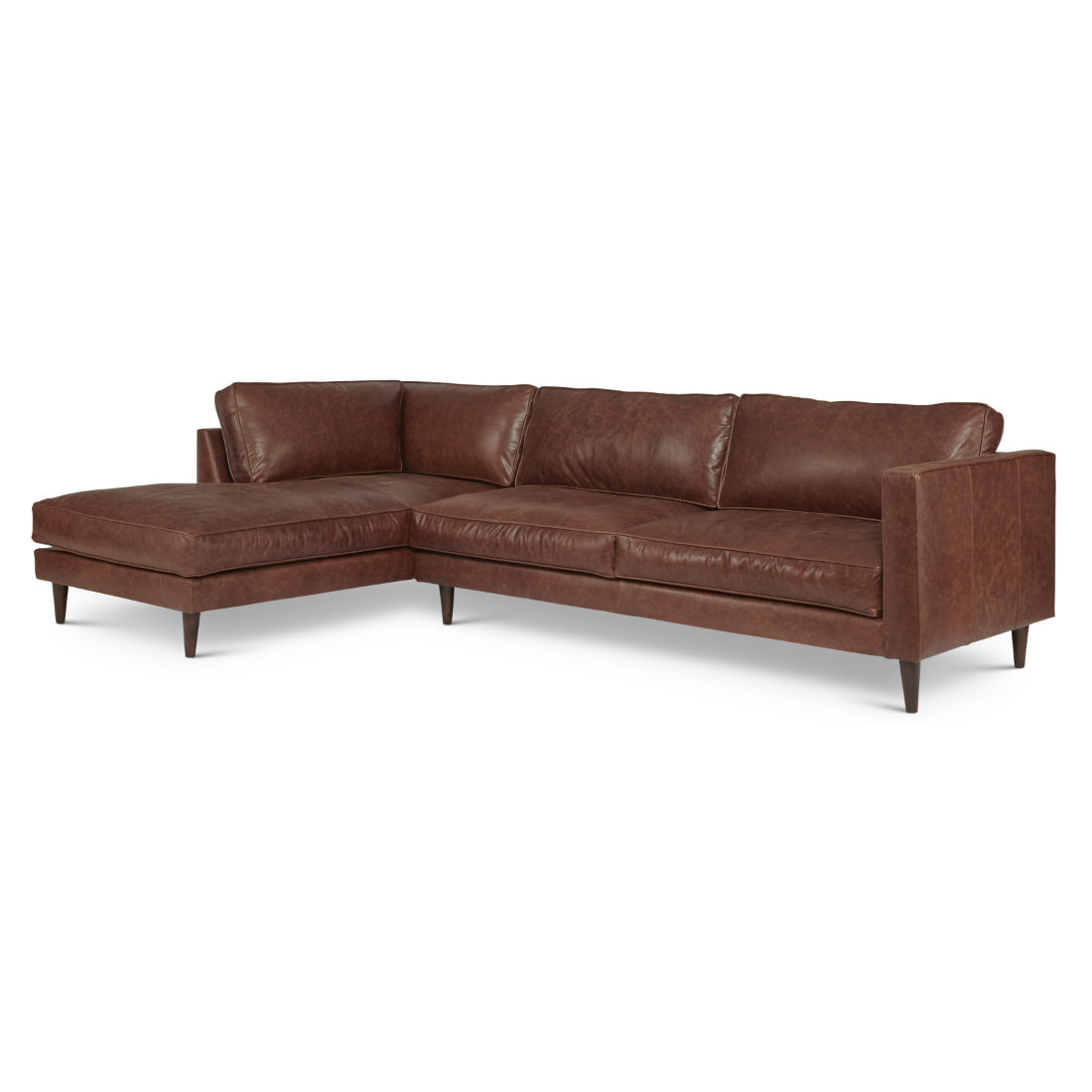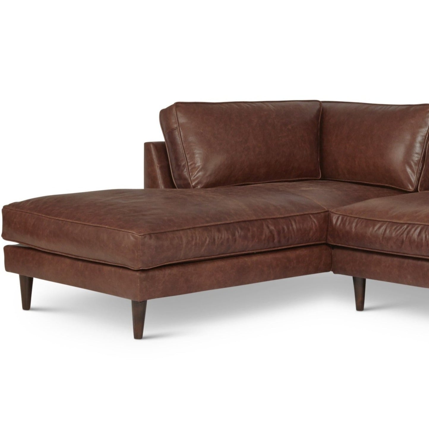 This deluxe right-arm sectional features a relaxed yet sophisticated design. It is crafted from top-quality full aniline leather, providing a soft and inviting feel. With sleek arms, welted cushion boxings, ample cushions, and tapered legs, this sectional adds a touch of elegance and contemporary style to any room. Its durability is evident in its sturdy construction, ensuring long-lasting support and comfort. Enjoy its luxurious and understated aesthetic.
