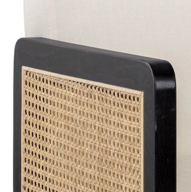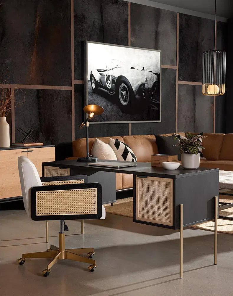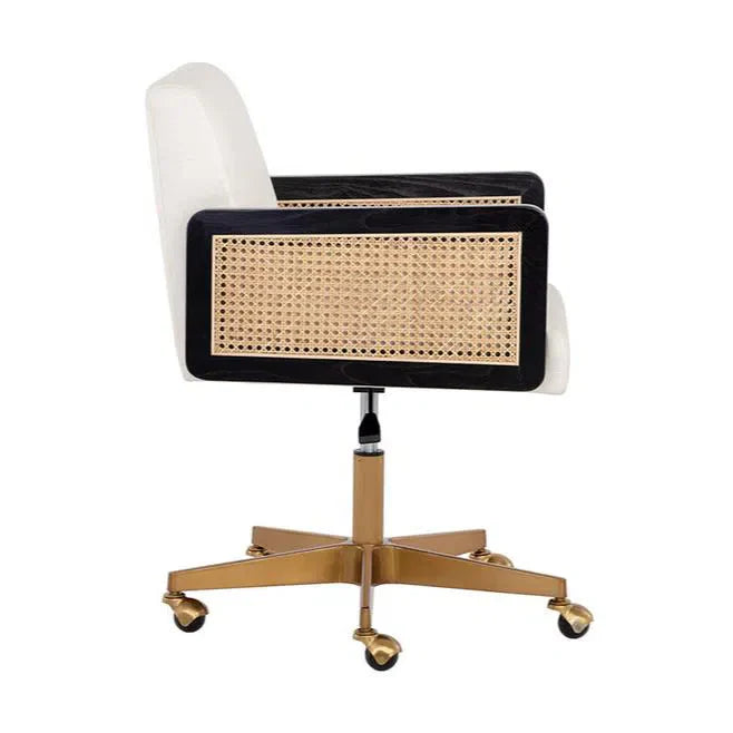 Combining modern style with a hint of global inspiration, this office chair will add texture to any workspace. The chair is stocked in linoso ivory performance fabric and features solid black rubberwood arms with accenting natural rattan. It is completed with a gold stainless steel base with castors, making it easy to move around. The performance fabric is moisture repellent, durable, and easy to clean.