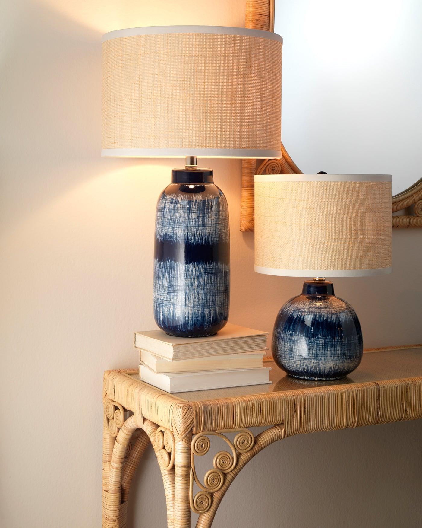 The Coastal Batik Blue Ceramic Table Lamps bring refined artistry and coastal charm to any setting. Inspired by traditional Japanese ceramics, each lamp is hand-glazed in indigo blue and white, creating distinctive finishes that make every piece one-of-a-kind. Available in both large and small sizes, these lamps are offered with either a white linen drum shade or a raffia shade, allowing you to match them perfectly with your decor. Their handcrafted ceramic bases, paired with thoughtful details, deliver a timeless coastal aesthetic that blends sophistication with individuality, making them ideal accents for contemporary and casual interiors alike.