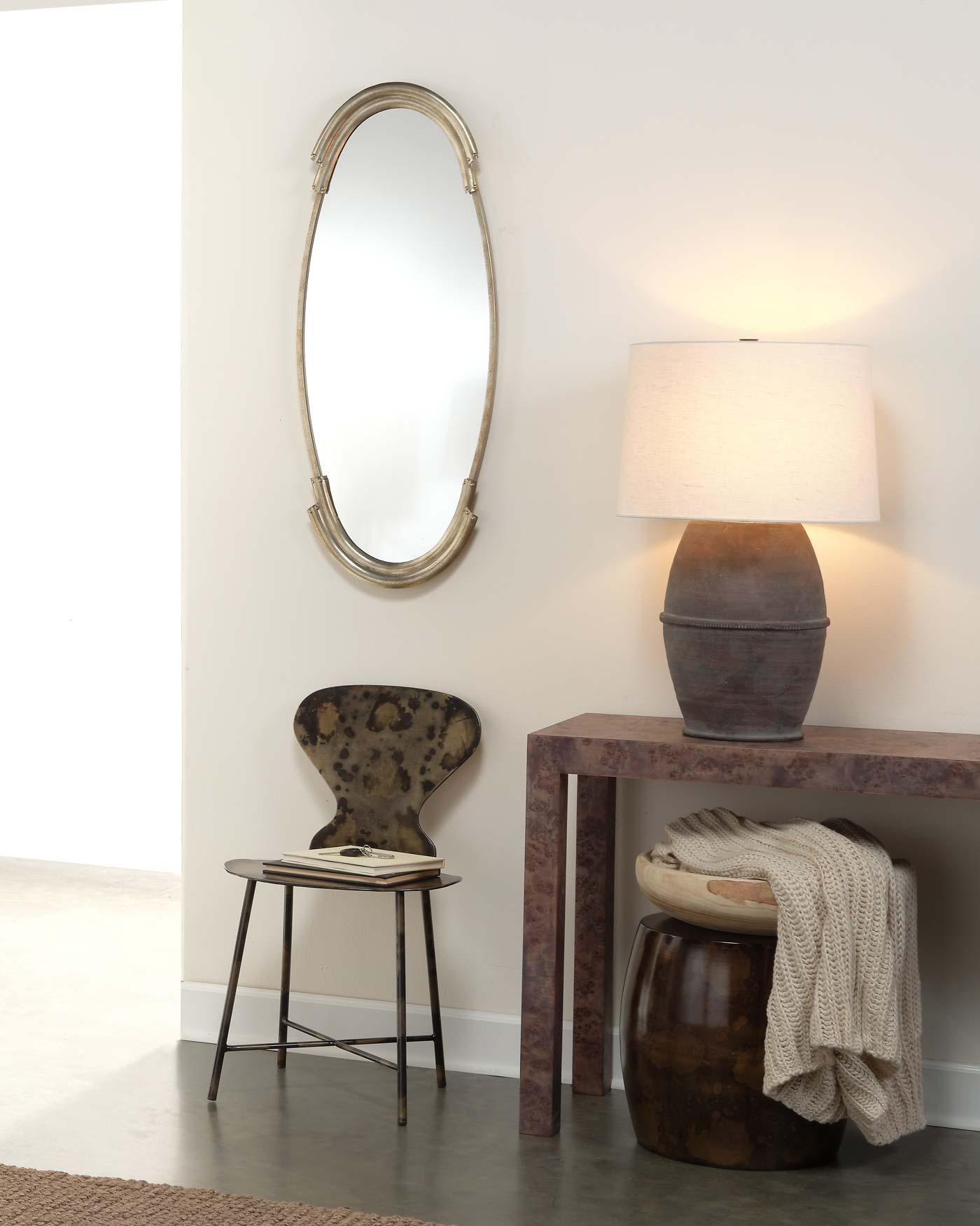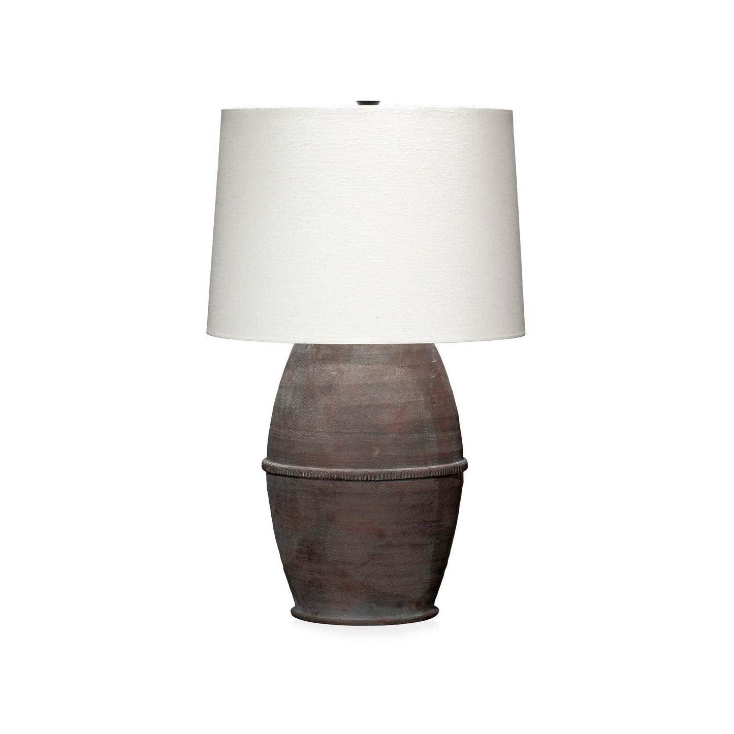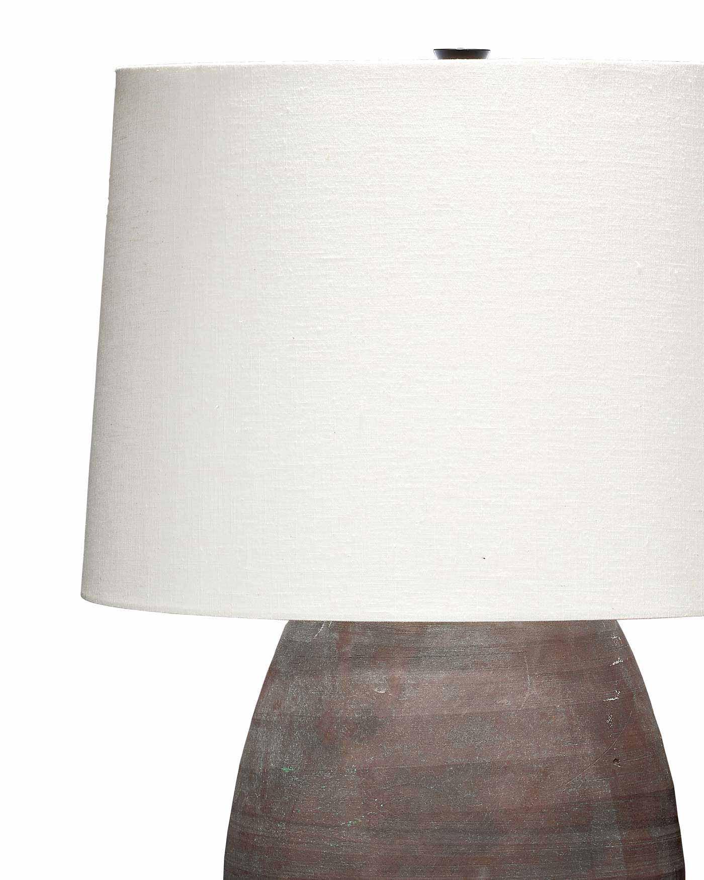 Add an earthy touch to your home with this Coastal Style Dark Grey Ceramic Antiquity Table Lamp. Featuring a unique thin raised band detail and a contrasting dark grey ceramic body, this lamp is sure to make a statement on any entry console or dining room buffet. Elevate your decor with this stylish and versatile piece. This large table lamp introduces an earthy tone and texture to a classic silhouette. The unique detail of a thin raised band draws attention to the body's midline, and the dark grey ceramic of the lamp's oversized body contrasts well with its clean white linen drum shade. This lamp is sure to make a substantial statement anywhere in your home, like an entry console or a dining room buffet.