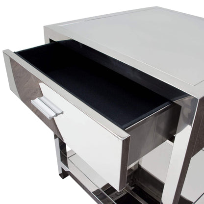 The Corleo table's dimensions make it an ideal choice for tighter spaces. It stands ready to serve as a stylish focal point or a subtle complement to existing furniture. Its polished stainless steel finish captures light beautifully, adding a touch of modern elegance to any setting. With its combination of style, function, and quality, the Corleo 1-Drawer Accent Table is a smart choice for enhancing home interiors.