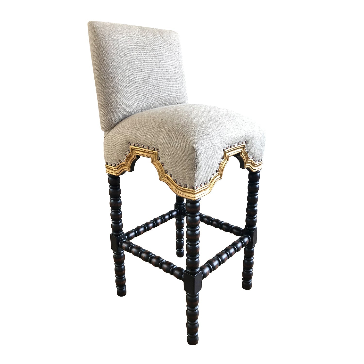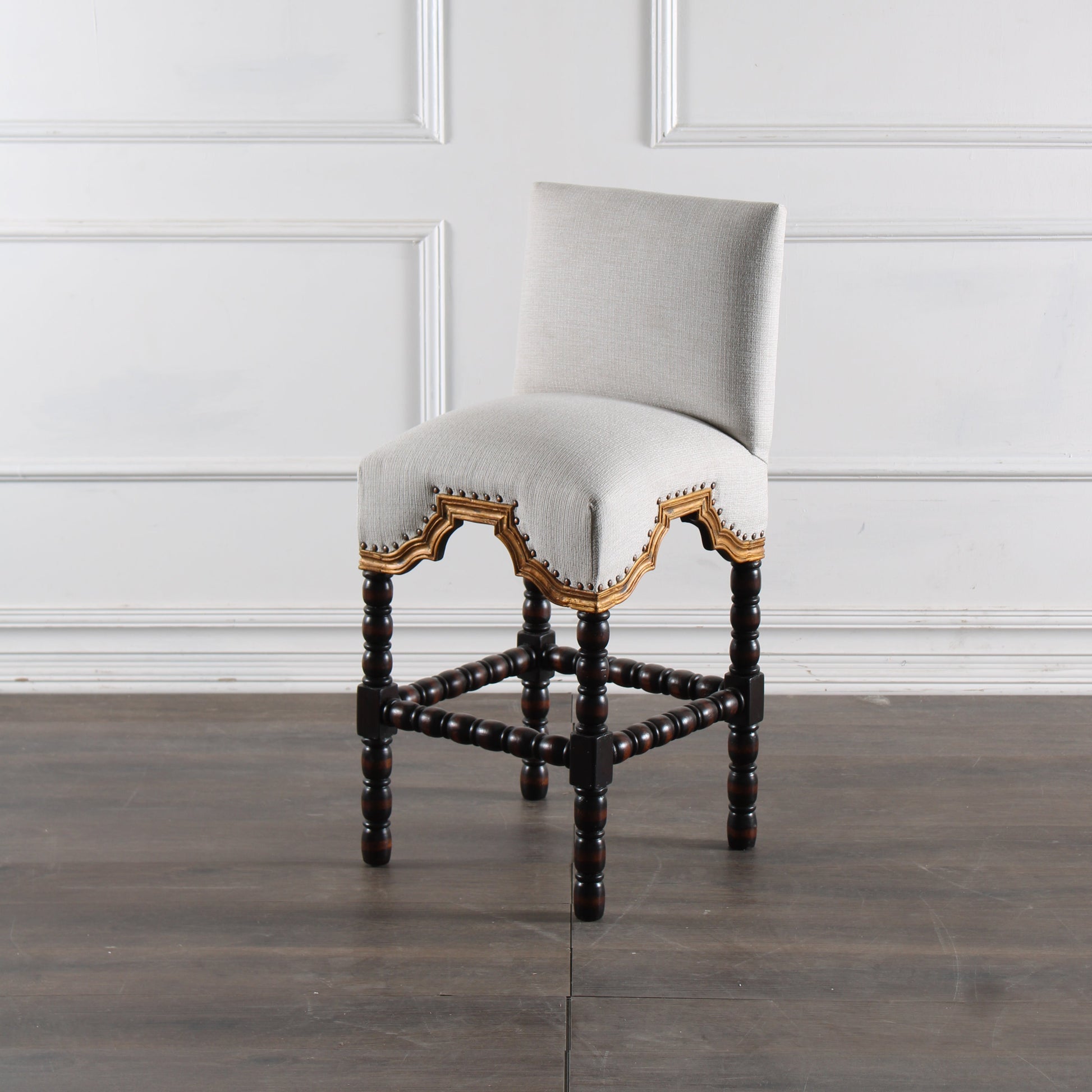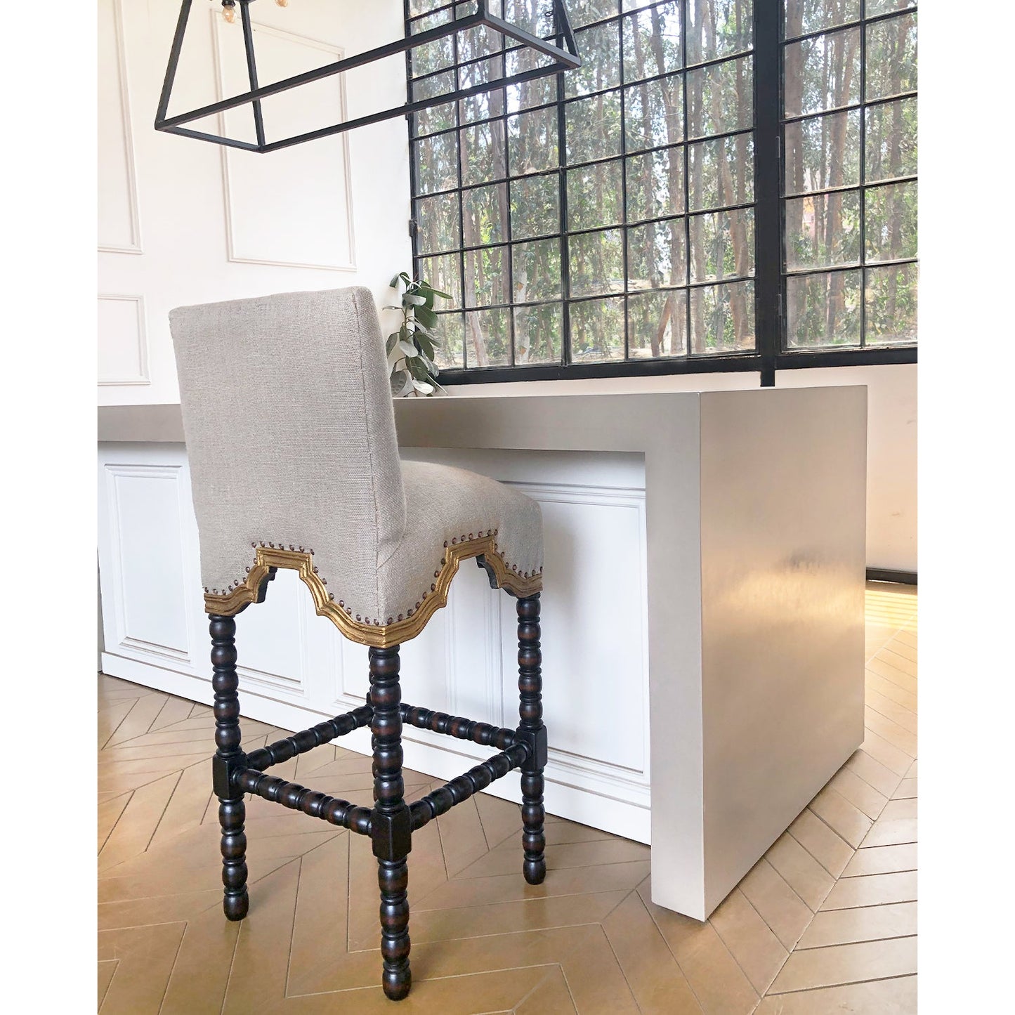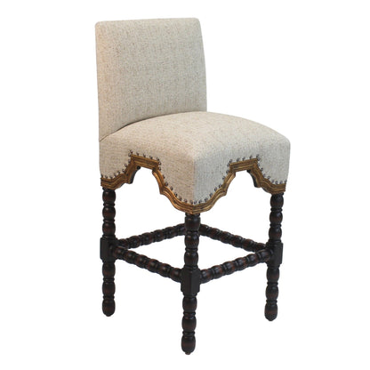 The Counter Stool San Marco seamlessly blends transitional style with timeless elegance, making it a sophisticated addition to any home. Expertly crafted from solid Peruvian hardwoods, this stool features beautifully turned legs finished in a smooth espresso with maple highlights and a hand-applied antique gold trim, enhancing its refined aesthetic. Upholstered in high-performance fabric available in cream or taupe, it offers both durability and comfort, ensuring a plush seating experience that withstands daily use. Hand-applied antiqued copper nails further accentuate its classic charm, showcasing exceptional craftsmanship.