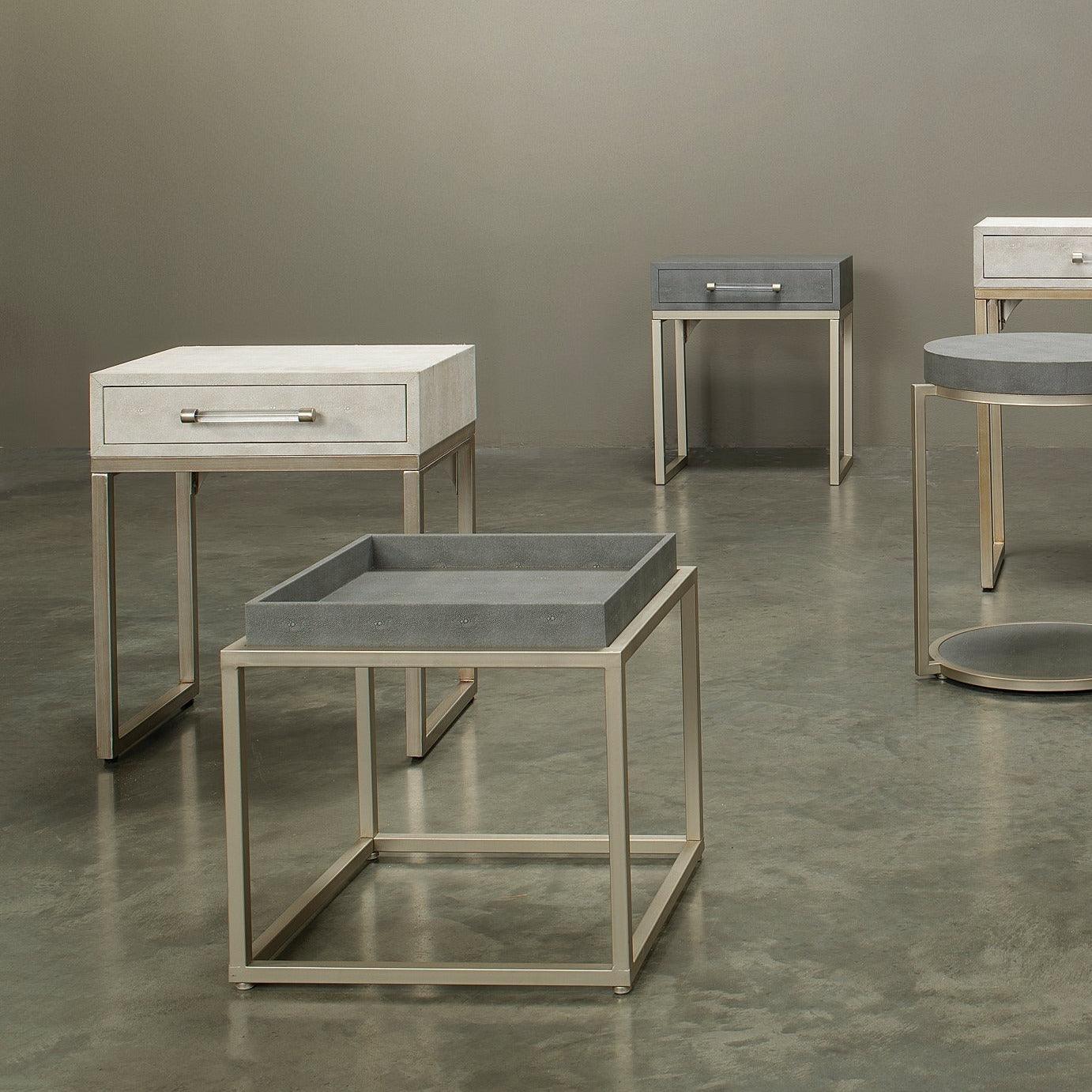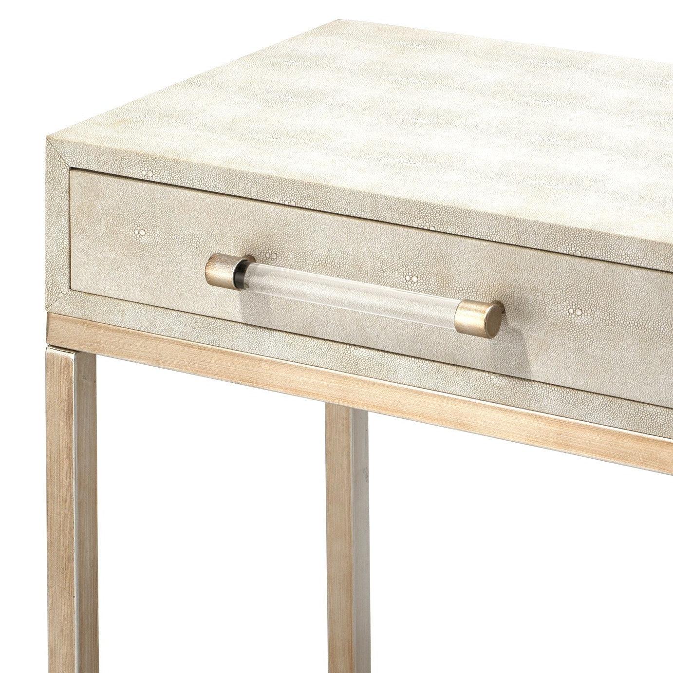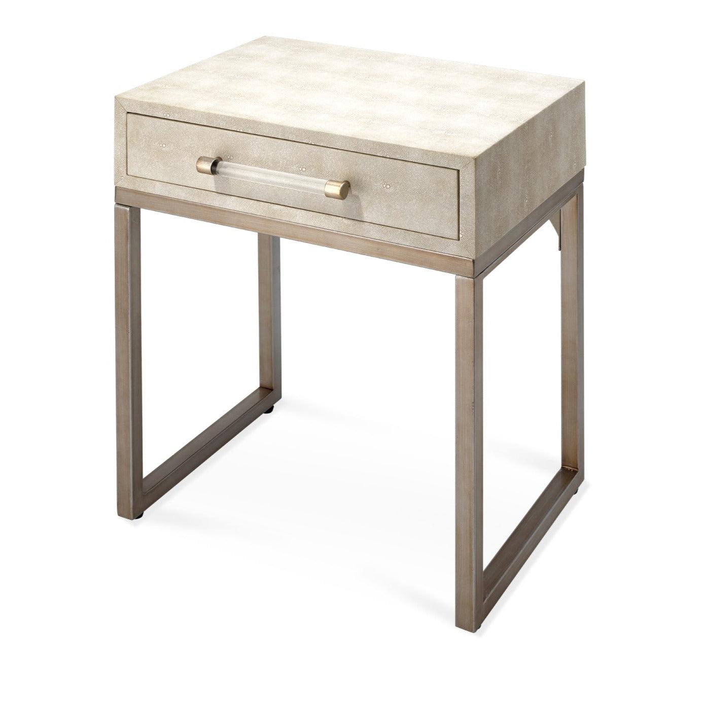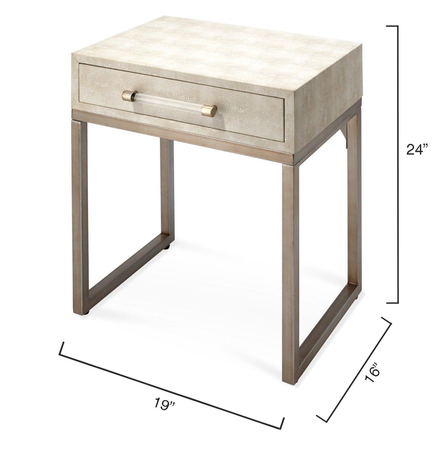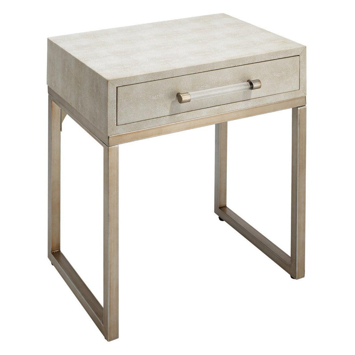 Elevate your space with our Cream Leather Mid Century Modern Side Table. Featuring a timeless ivory faux shagreen wrap and an antique brass finished base, this table exudes both luxury and elegance. The single drawer, with an acrylic and antique brass pull, adds both style and function to this unique piece. The exotic and Modern texture of stingray skin or shagreen has been a favorite of designers since the 30's. The side table has been wrapped in our ivory faux shagreen and mounted on a antique brass finished base. 1 drawer with acrylic and antique brass pull. "The Cream Leather Mid Century Modern Side Table combines the timeless appeal of stingray skin with modern design for a truly unique piece.