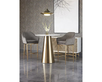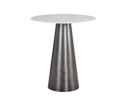 This absolutely stunning tapered bar table features a white marble top that elevates any contemporary dining or lounge space. Available with either a brushed gold or brushed gunmetal base, it is suitable for both residential and commercial environments. As marble is a natural material, each piece exhibits unique veining, pitting, fissures, micro-cracks, and color variations, all of which contribute to its distinctive beauty. Materials: Marble, Stainless Steel Colors: Gold; Gunmetal Dimensions (in): 35.5 D x 39.5 H Weights (lb): 117 16mm Matte Carrara Marble Top Due to various screen settings the color of the item may look slightly different in person from what you see on your screen. We try to make sure that the image you see is as accurate as possible.