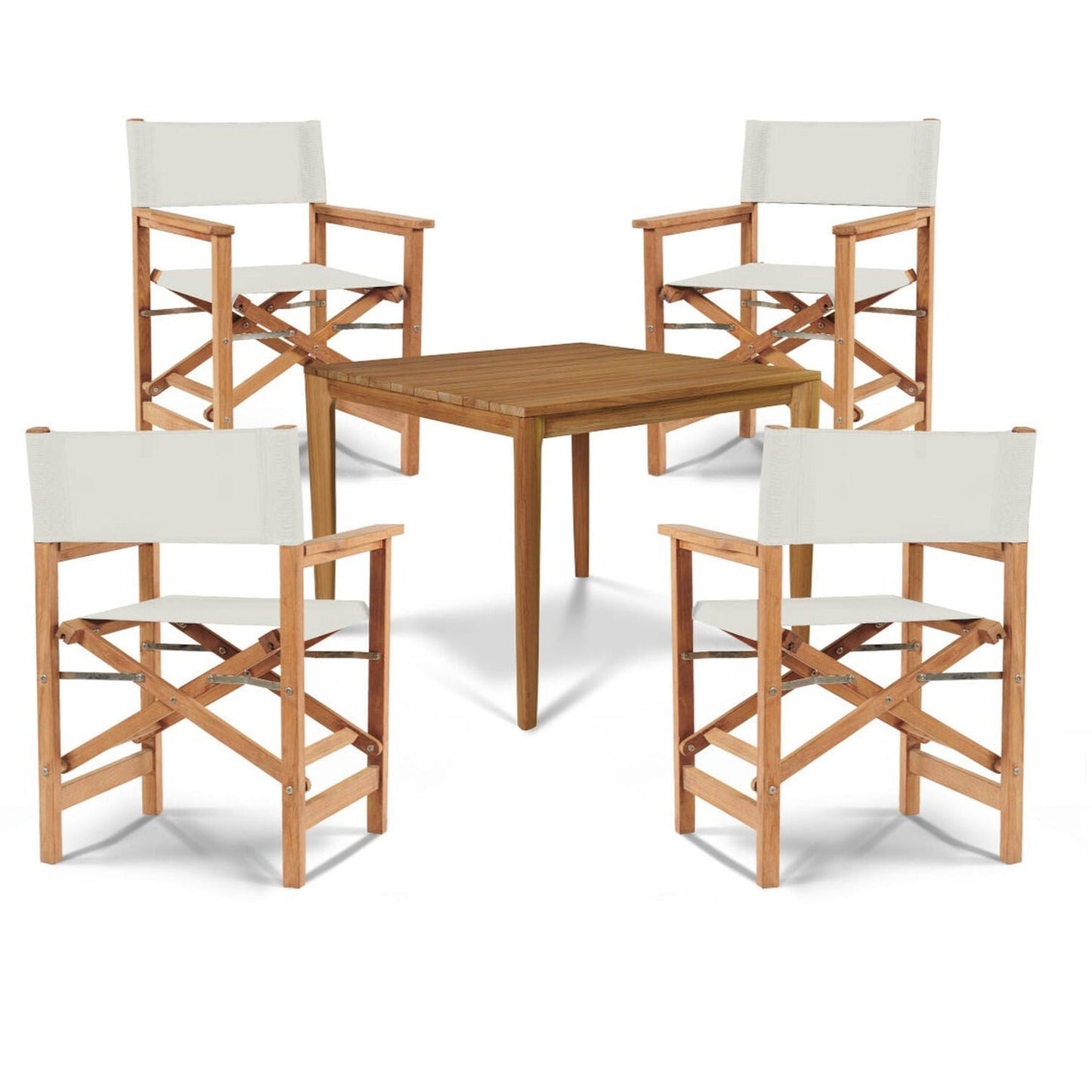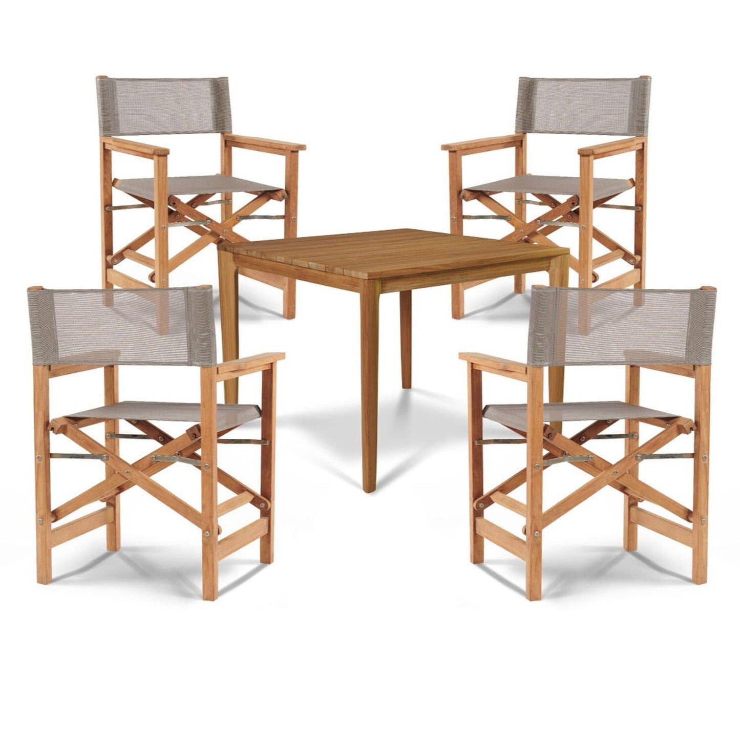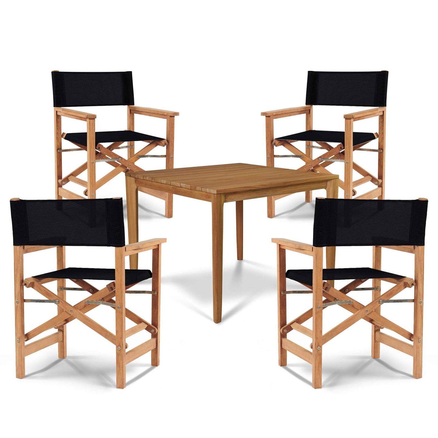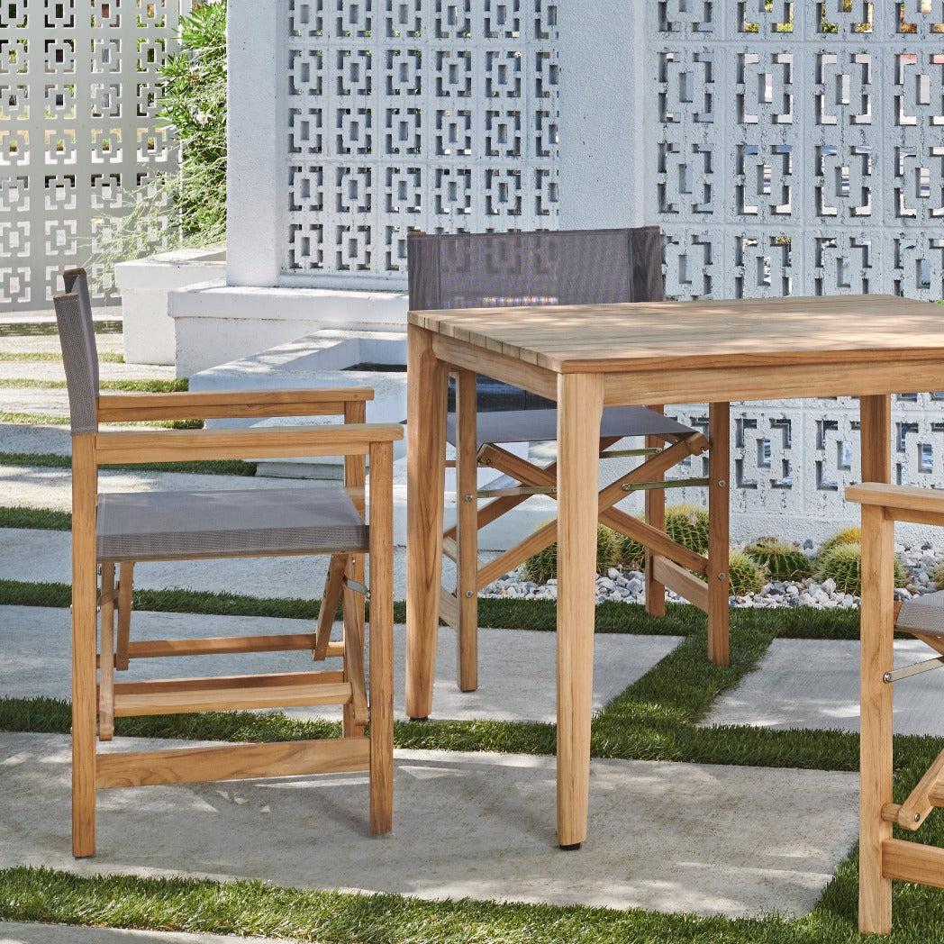Tap into your adventurous spirit with the Del Ray 5-Piece Square Teak Outdoor Dining Set. This striking set features a contemporary design perfect for smaller spaces and casual dining. With a sturdy folding frame made of premium teak and a weather-resistant sling seat, this iconic chair is perfect for any outdoor setting.