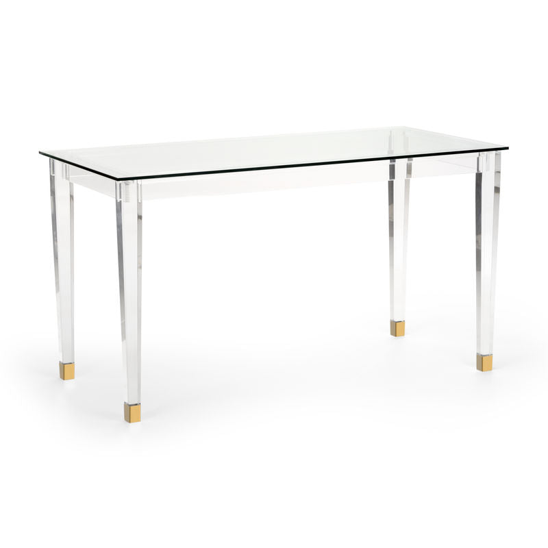The Acrylic Denver Desk with Nickel and Brass Accents is a perfect blend of style and functionality. Designed with a sleek acrylic frame and nickel-brass accents, it offers a modern and sophisticated look that fits seamlessly into any office or home setting. The clear acrylic material enhances the desk's contemporary aesthetic while maintaining a clean and airy feel. Its tempered glass top provides a durable and smooth surface for all your work or study needs, ensuring both practicality and elegance in one stunning piece. This desk not only serves as a functional workspace but also as a statement piece. Its minimalist design allows it to complement a wide range of interior styles, from modern to eclectic, without overwhelming the space.