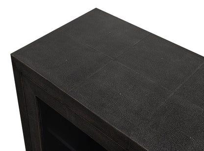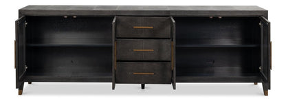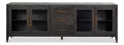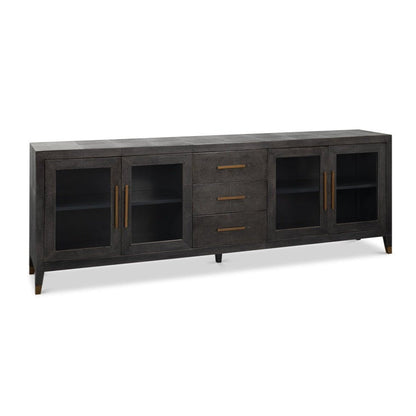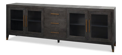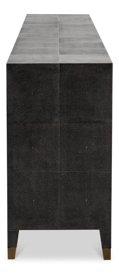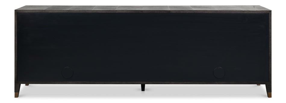 The Desmond Sideboard Shagreen Antique Grey With Brass Charm is a blend of style and function that adds sophistication to any home. Wrapped in antique grey blackstone shagreen leather, this piece exudes a refined elegance. It features a transitional design that fits seamlessly into a variety of decor styles. The aged brass pulls and capped legs enhance its visual appeal, making it a standout addition to your living space.