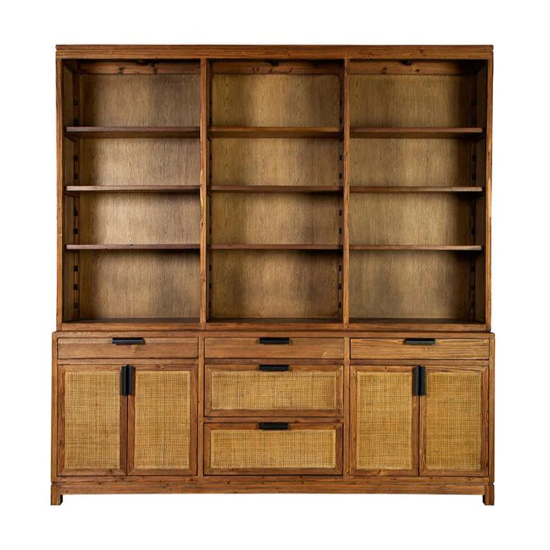 The cabinet includes three open shelves, offering versatile storage options for displaying books, decor, or cherished keepsakes. The lower cabinets, adorned with rattan panels and black handles, provide additional concealed storage. This design not only adds to the visual appeal but also ensures practicality, helping you keep your space organized. The combination of materials and design details creates a cabinet that is both stylish and functional.