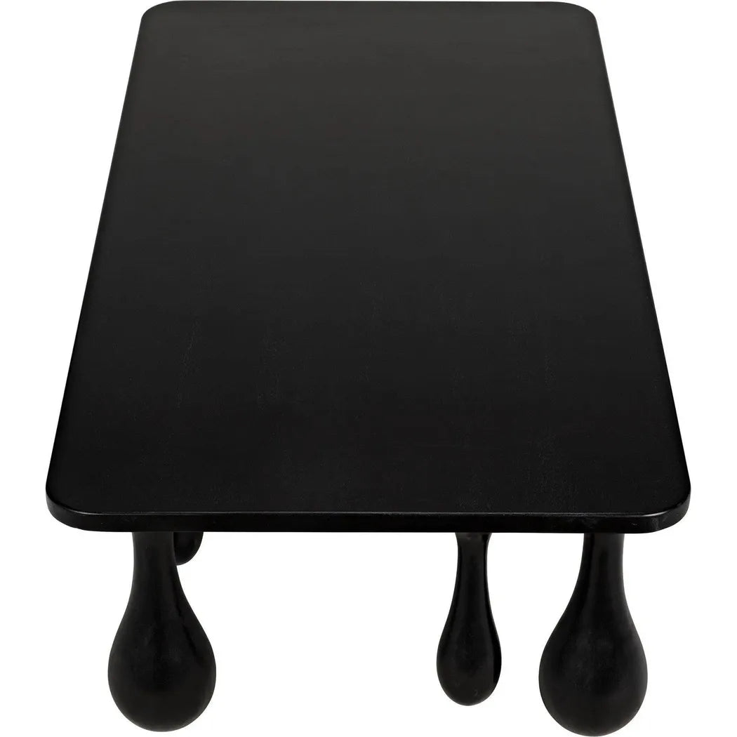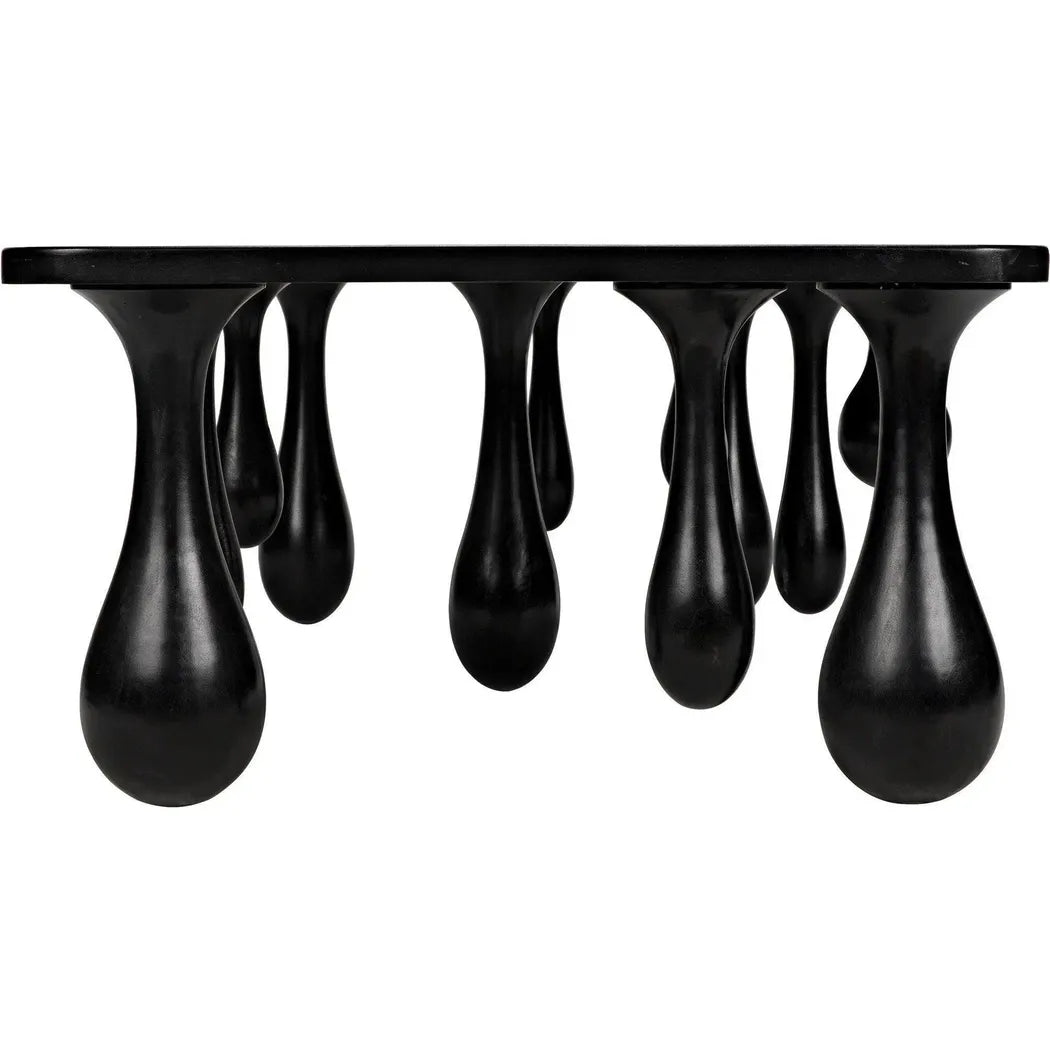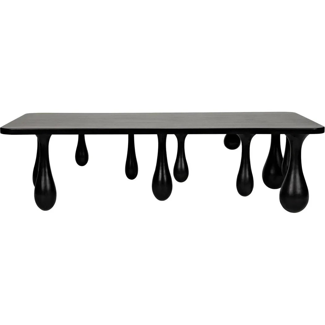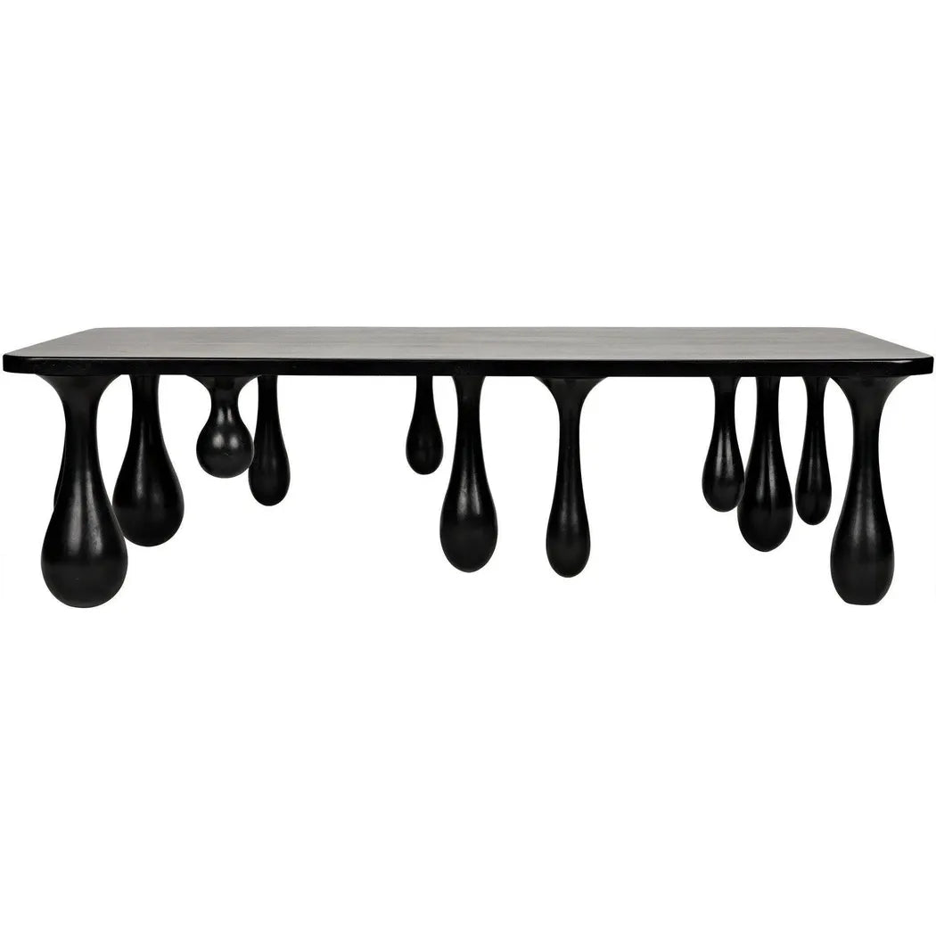 Enhance your living space with the Drop Wood Black Rectangle Coffee Table. Skillfully made from high-quality carved mahogany wood, this table boasts playful droplet legs and a stunning black finish with a white overlay that highlights the wood's grain. With expert craftsmanship and attention to detail, it's the perfect statement piece for any room. The Drop Coffee Table playfully embodies a sense of movement and mood with its intricately carved mahogany droplet legs. Its black finish with a white overlay highlights the beautiful grain of the mahogany wood.