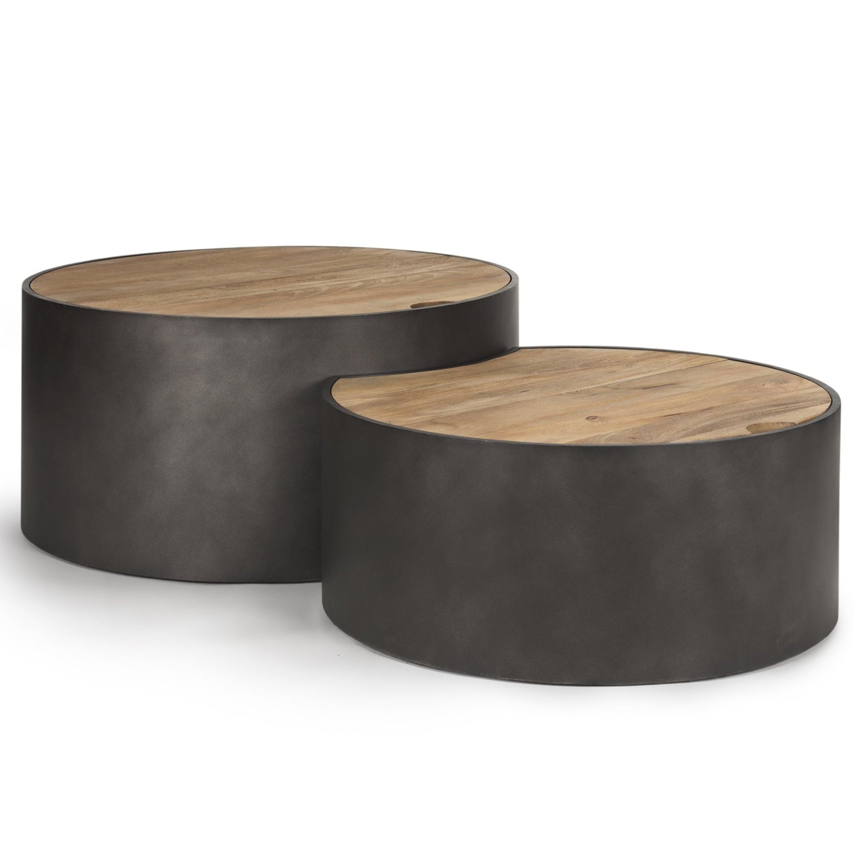 The Eclipse set of round nesting tables is a perfect blend of modern design and practical functionality. These tables come in a pair, with the smaller piece designed to fit seamlessly into the larger one, creating a puzzle-like effect. The tables boast a striking contrast with their painted gunmetal gray iron bases and natural wooden tops featuring a sandblasted texture. This combination not only adds visual appeal but also ensures sturdiness and durability.