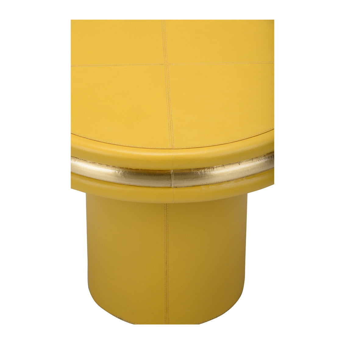 The Edison Leather Coffee Table brings a touch of elegance and warmth to any room. Wrapped in rich, honey-colored leather, this coffee table combines luxury with practicality. Its circular design and golden brass banding make it a standout piece that captures attention. This unique table is designed to brighten any space, offering a perfect blend of style and functionality. The leather-covered base provides stability and adds to the overall sleek appearance, making it a versatile addition to both modern and traditional settings. Crafted from quality materials, the Edison Leather Coffee Table is built to last. Its yellow color adds a vibrant touch to your decor, while the golden brass accent enhances its visual appeal.