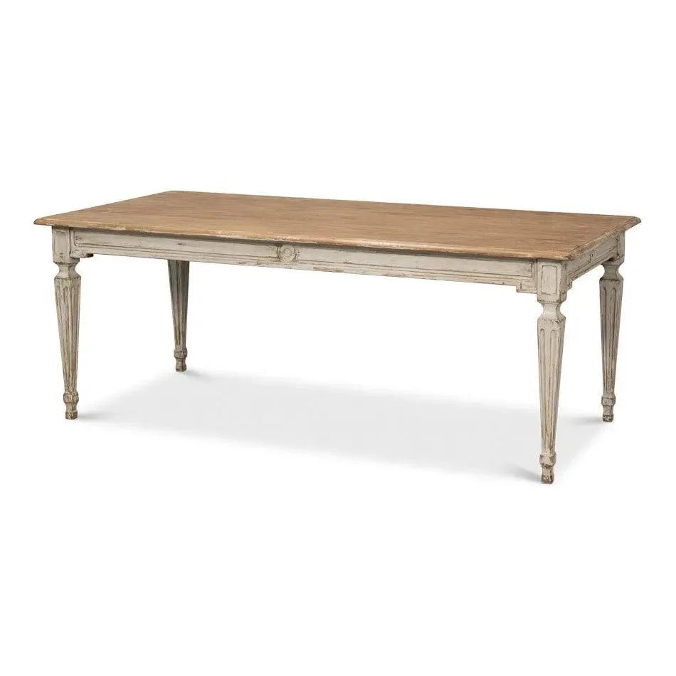 The Elise Dining Table in elegant grey is a versatile addition to your transitional decor. It provides ample dining space. The light grey base with a natural top adds a touch of sophistication. Crafted from pine, this table combines style with durability. Elevate your dining experience with the Elise Dining Table. Constructed from sturdy pine, the Elise Dining Table offers both tasteful design and lasting strength. It features a sophisticated grey and natural finish that complements transitional decor, while also providing ample space for dining.