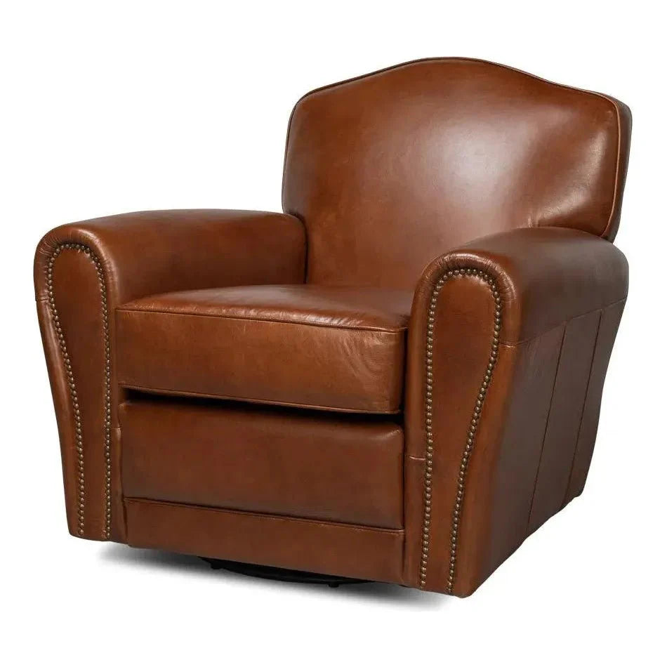 Introduce elegance and practicality to your home decor with the Elite French Swivel Brown Leather Club Chair. Upholstered in vintage Havana Leather and featuring a swivel base, this statement piece offers style and functionality. Crafted from top grain cow Leather and metal, it guarantees both luxury and durability. Elevate your space with this timeless and opulent chair.