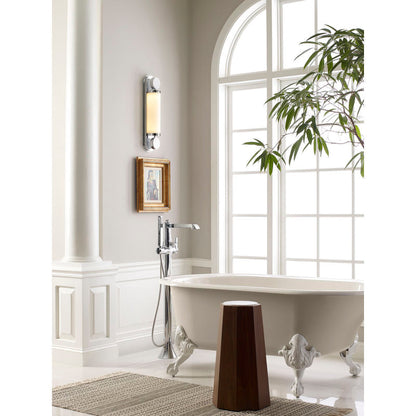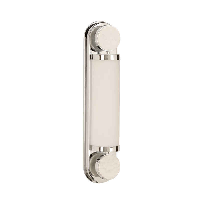 The Emmons Sconce is designed to elevate any room with its timeless elegance. Its combination of materials—metal, glass, and honed Carrera marble—creates a stunning visual impact wherever it is placed. This sconce is versatile, looking equally beautiful when installed to flank a bathroom vanity or line a hallway. The unique design features a pair of honed Carrera marble spheres that elegantly frame the central glass column, adding a touch of luxury to your decor. This piece offers flexibility with its installation options; it can be mounted vertically or horizontally, allowing it to fit seamlessly into various spaces. The cylindrical shape with brass and nickel finish, paired with a white frosted glass diffuser, contribute to its modern design, providing both style and function.