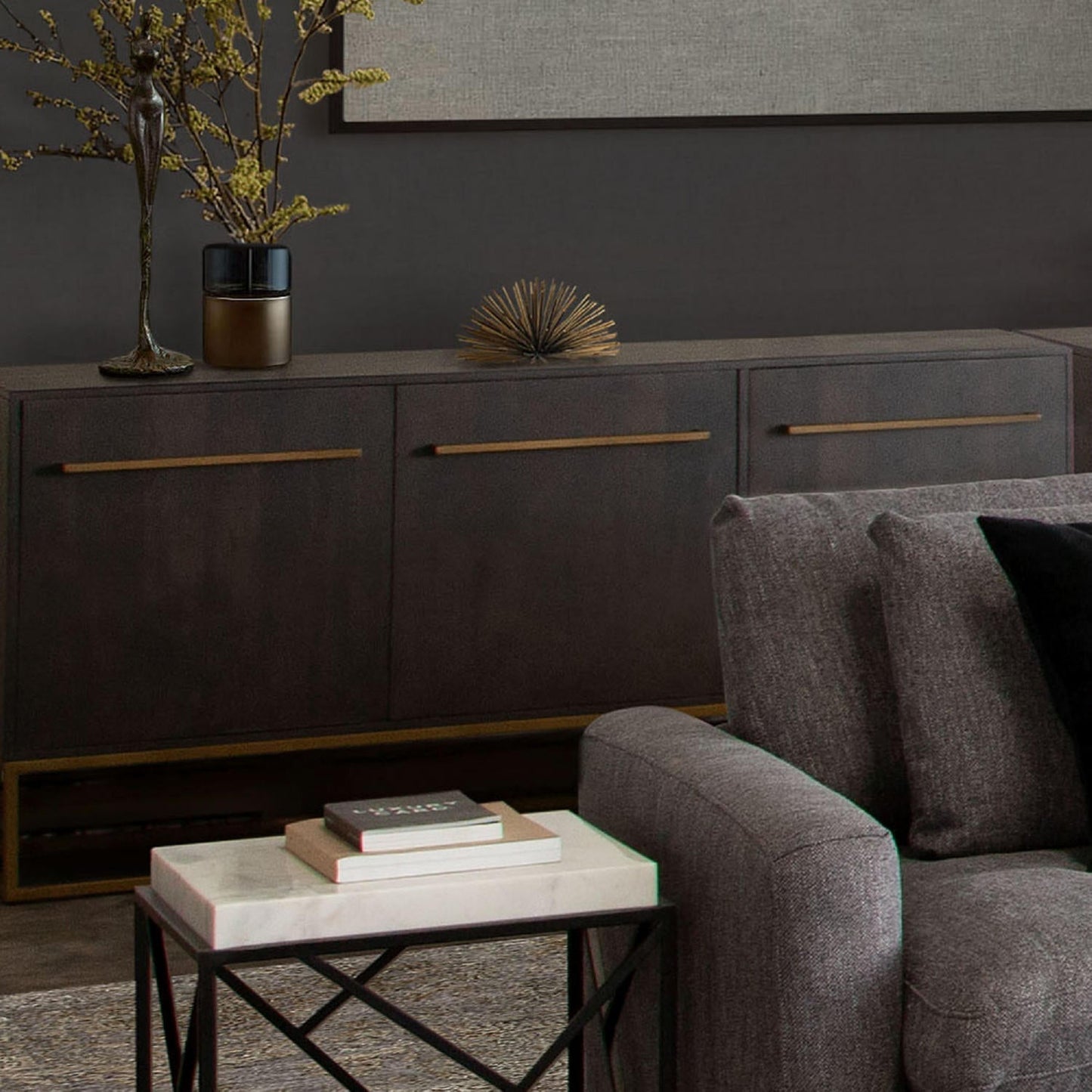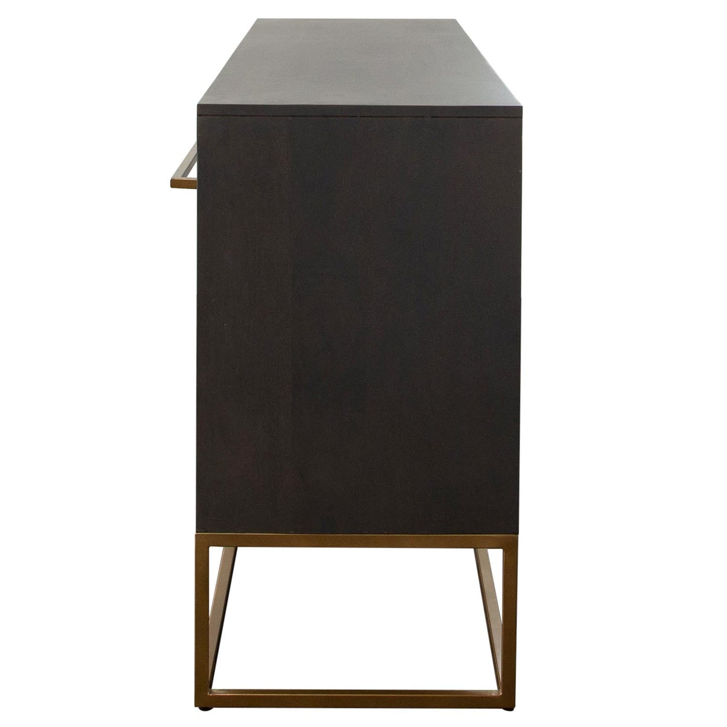Crafted with Solid Mango Wood and finished in a striking Grey Oak, this collection boasts a clean aesthetic and bold accents of Distressed Gold Metal. Take the risk and bring home the 1-Drawer End Table, 3-Door Sideboard, and 2-Door/2-Drawer Entertainment Cabinet for a daring touch of style. Don't pass up this chance to make your home truly exceptional!