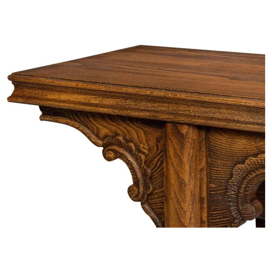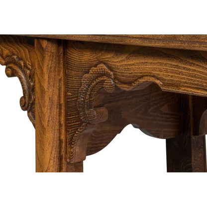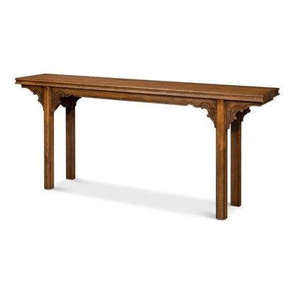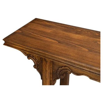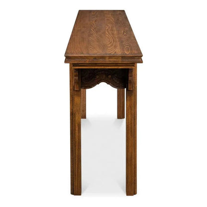 The rectangular shape features intricate carving along the apron and is adorned with an antique brass bail hardware pull on the single storage drawer. The drawer effortlessly glides on wooden slides for a smooth and stable movement. Underneath, an open shelf provides ample space for displaying wicker baskets, books, or decor. Place this versatile console table behind a sofa or under a wall-mounted TV for a touch of elegance. Some assembly is required for this timeless piece.