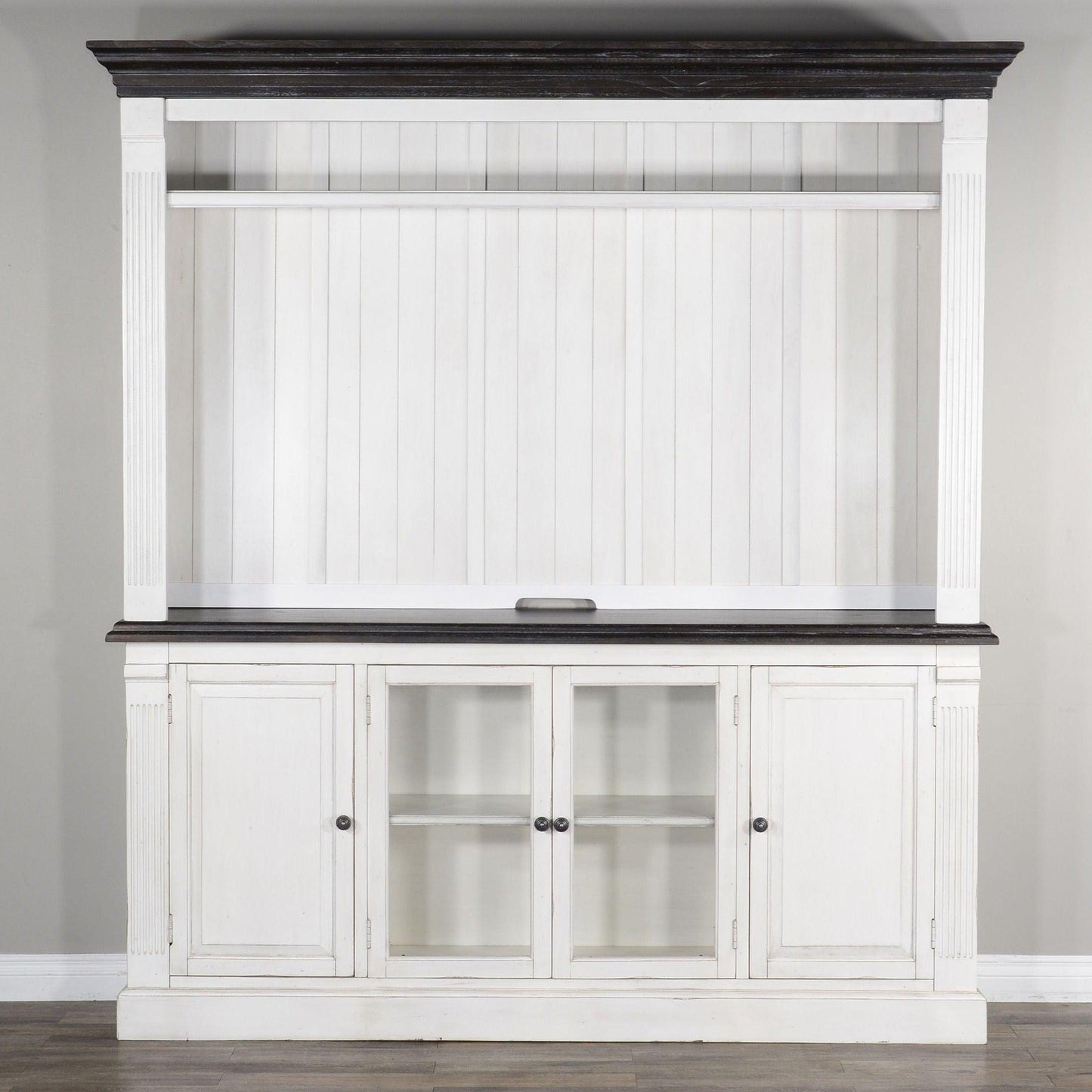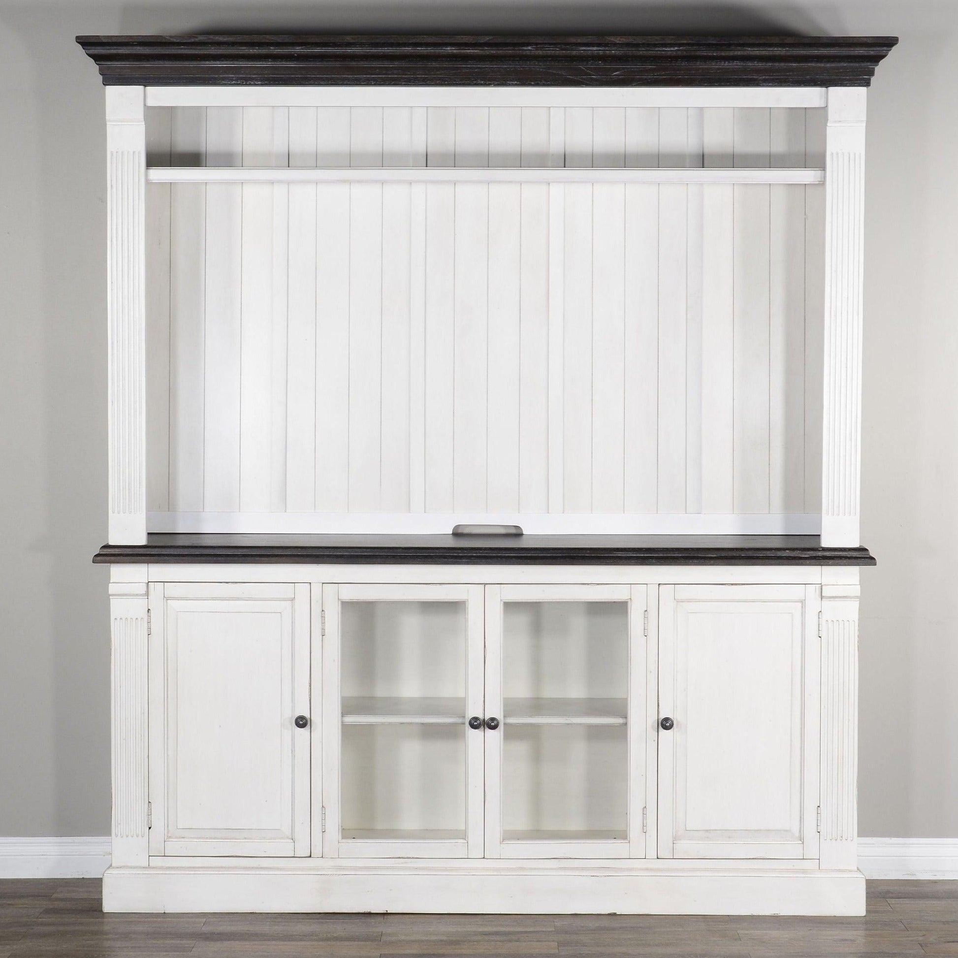 European cottage styling in a warm two-tone antique white and brown finish. Sturdily constructed with mahogany solids and Mindi veneers, the European Cottage collection will add warmth and charm to your space. This entertainment wall unit is impressive is scale, size, and function. At the center, with two center glass doors and two side wood doors, the TV console with a contrasting finish top is the perfect combination of display and storage space. Its large size is perfect for even some of the largest flat-panel TVs. Meanwhile, the top hutch's open shelf, the side shelving on the left and right piers offer further display space for accents and books. The piers' lower cabinet add closed storage.