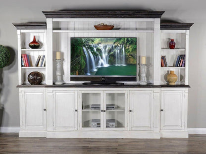 Constructed with high-quality materials and crafted in a European cottage style, the 124" Entertainment Wall Unit TV Stand Media Console White is both aesthetically pleasing and functional. With plenty of storage options, including center glass doors and side wood doors, this unit is perfect for even the largest flat-panel TVs. The top hutch and side shelving provide ample display space for accents and books, while the lower cabinets add additional closed storage. Add warmth and style to your space with this impressive wall unit.