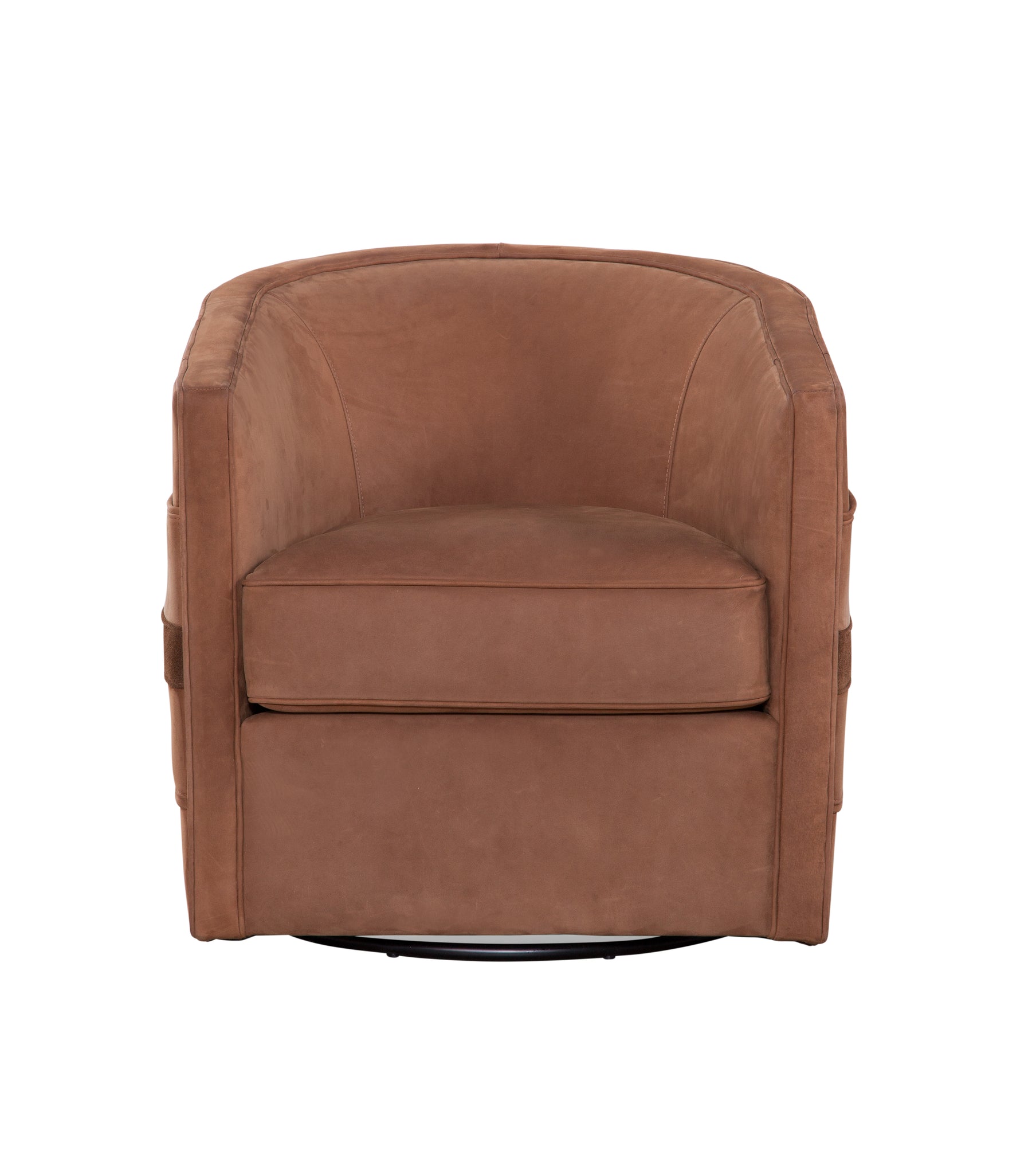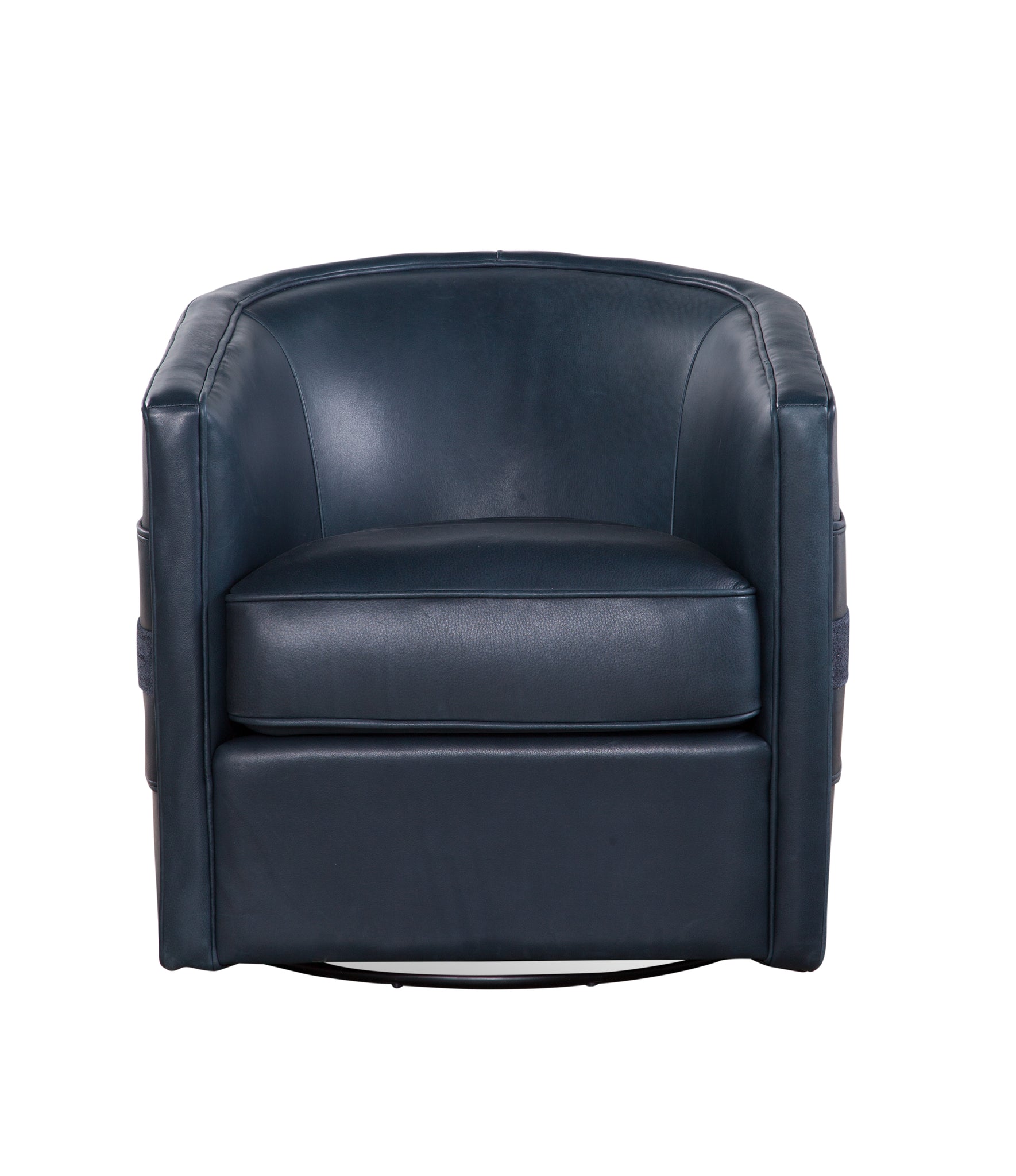 Introducing the perfect blend of style, comfort, and functionality with the Everlea Swivel Chair in Athena Night and Hepburn Cider. Both chairs are crafted with top grain leather, offering a luxurious and durable seating experience. The Athena Night finish in a rich navy blue and the Hepburn Cider finish in a warm, inviting tone add a sophisticated touch, fitting seamlessly into any modern or classic living space. The elegant contrast bow detailing further enhances the charm of both chairs, making them stand out in any room.