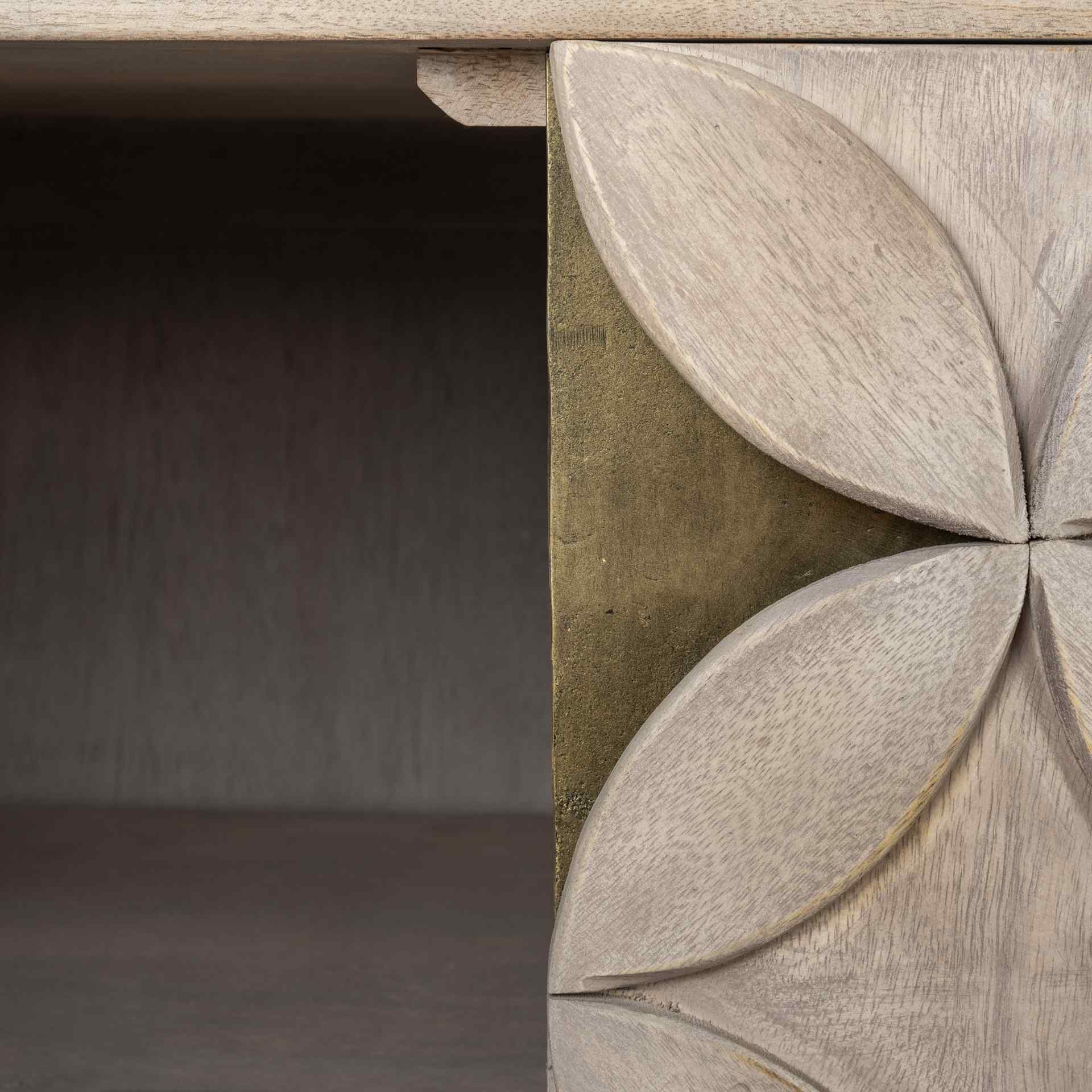 The Excelsior Four Doors Wood Sideboard is a stunning addition to any home, offering both beauty and functionality. Crafted from solid Indian mango wood, this piece boasts a natural brown finish that highlights the wood's unique grain and knots. The sideboard's intricate star-in-circle pattern on the door fronts adds a touch of elegance and makes it a standout piece in any room. Supported by a four-legged frame and an X-shaped base finished in an antiqued-gold tone, this sideboard not only captivates with its design but also ensures stability and balance.