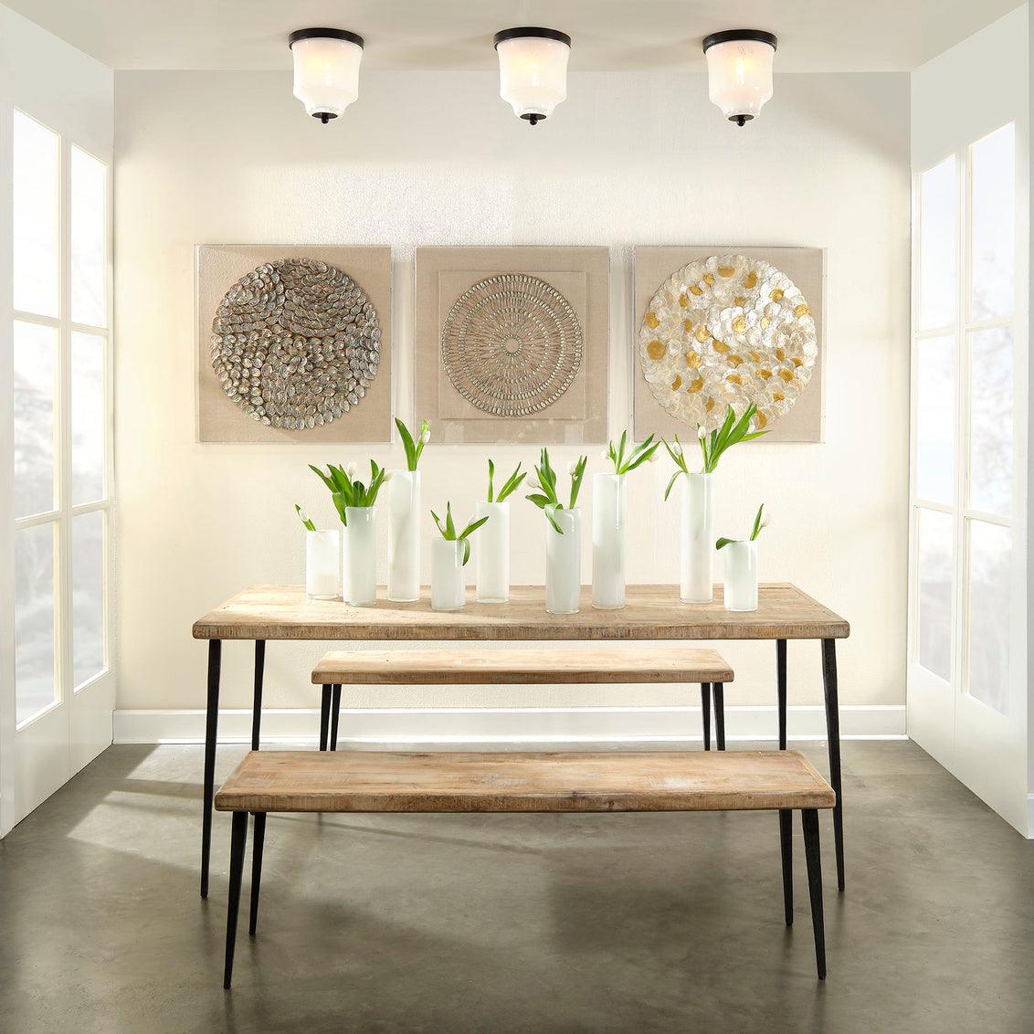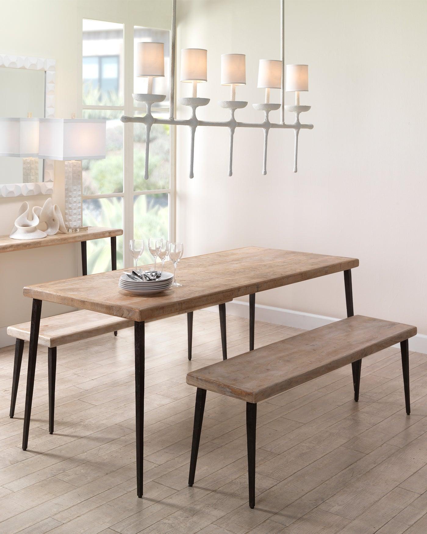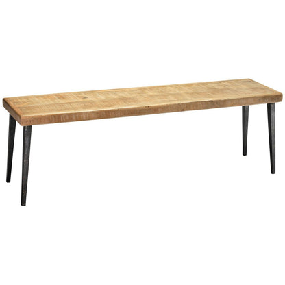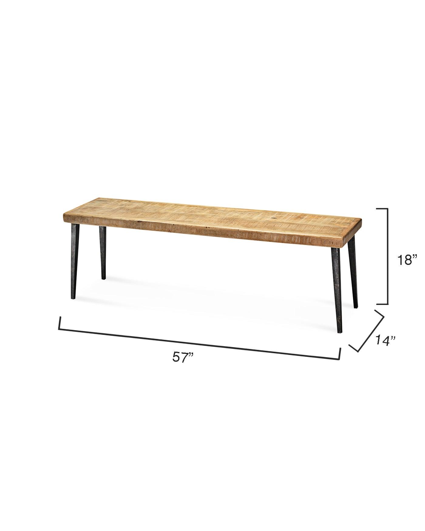 Experience the perfect blend of contemporary flair and farmhouse charm with our 57" Wood Top Metal Base Dining Bench. The hand-waxed, natural wood top exudes elegance and sophistication, while the hammered antique iron legs add a touch of rustic beauty. Elevate your dining experience with this must-have piece for those who appreciate the finer things in life. Bringing together Modern design with Rustic Farmhouse style to hand worked, waxed, Natural wood tops and hammered antique iron legs. A perfect blend of contemporary flair and farmhouse charm. The wood tops are carefully crafted with hand-waxed finishing, while the hammered antique iron legs add a touch of rustic elegance. A must-have for those who appreciate the finer things in life.