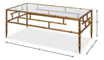 The Faux Bamboo Metal Coffee Table 48 brings a touch of elegance to any living space. Its classic design is enhanced by a rectangular glass top that adds a sense of openness and lightness to the room. The table's gold antique finish gives it a timeless charm, making it a perfect fit for both traditional and contemporary settings. The shapely legs and intricate detailing of the bamboo-style frame add a unique flair, ensuring that this piece will be a centerpiece in your home.