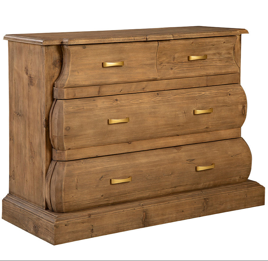 The Natural Fiona Chest is crafted from solid reclaimed elm, showcasing a beautiful medium brown tone that brings warmth to any space. Its design combines modern aesthetics with practical functionality, featuring two spacious bottom drawers and two smaller top drawers. These elements offer ample storage, making it a suitable addition to both bedrooms and living areas. The chest's softly curved drawer edges add a gentle, feminine touch to its overall look, while the smooth gold metal pulls introduce an elegant contrast, enhancing its appeal.