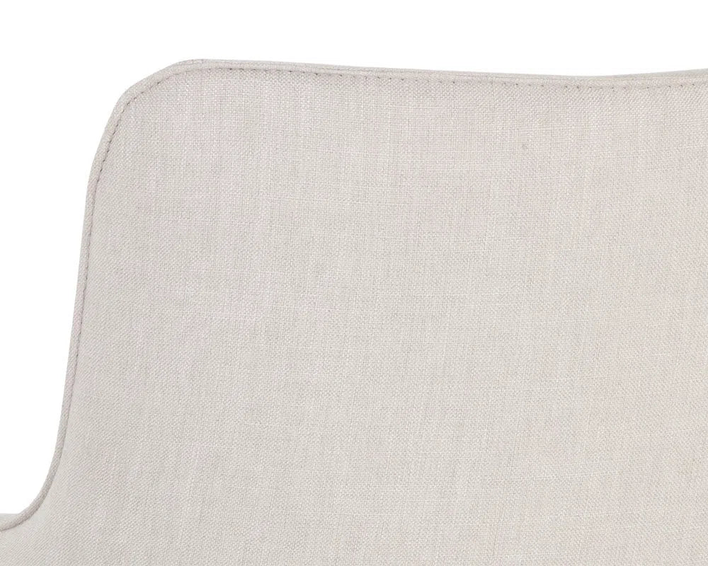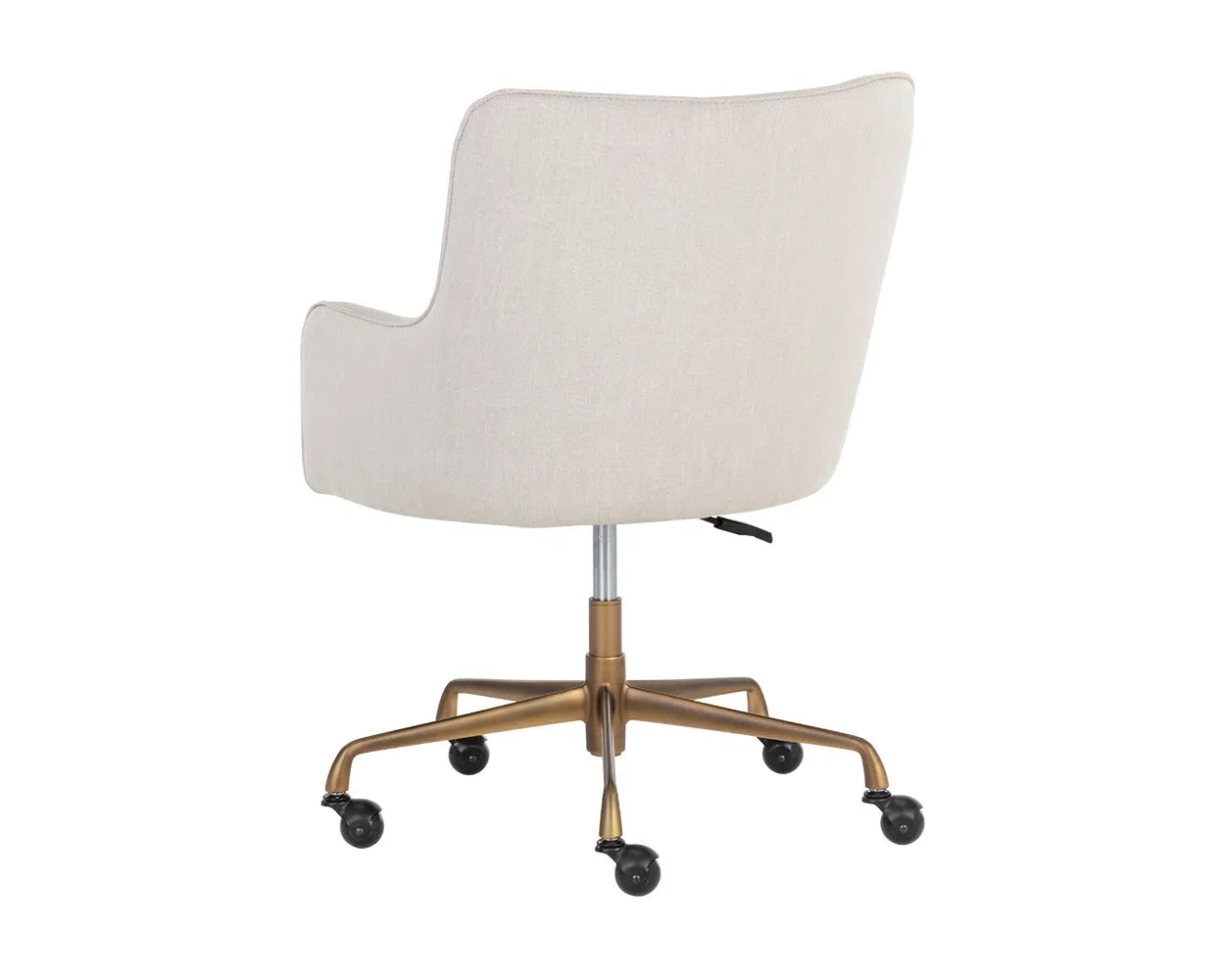 The Franklin Office Chair combines rustic and mid-century modern styling with its compact barrel back design. Available in beige linen fabric or vintage black faux leather, this chair features a rustic bronze aluminum base and castors for easy mobility. The faux leather option may display natural variations such as color differences and light scratches, adding unique character to each piece.