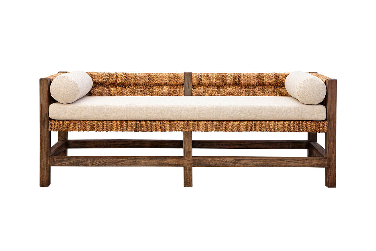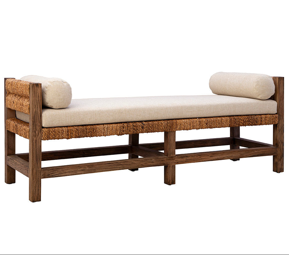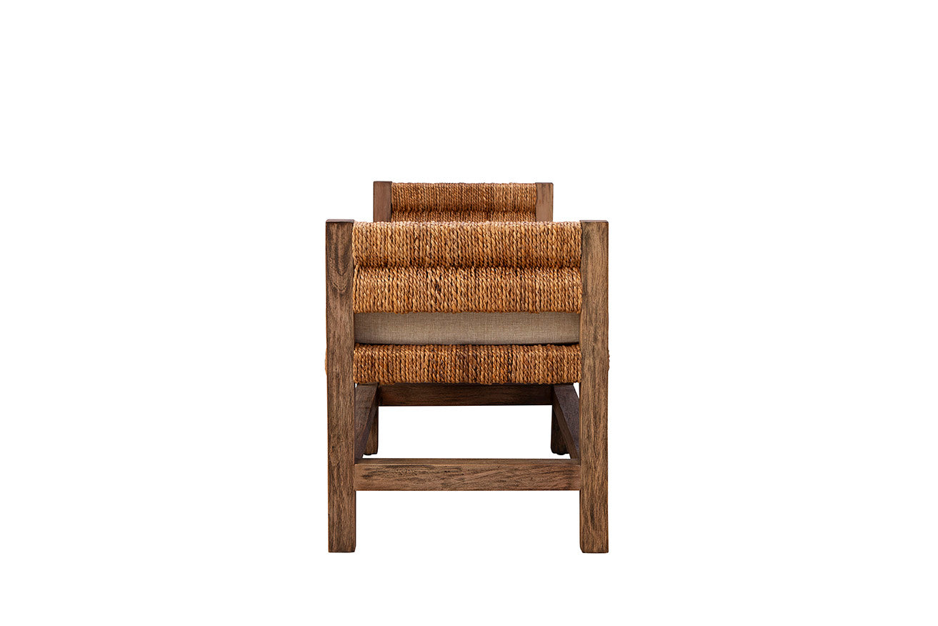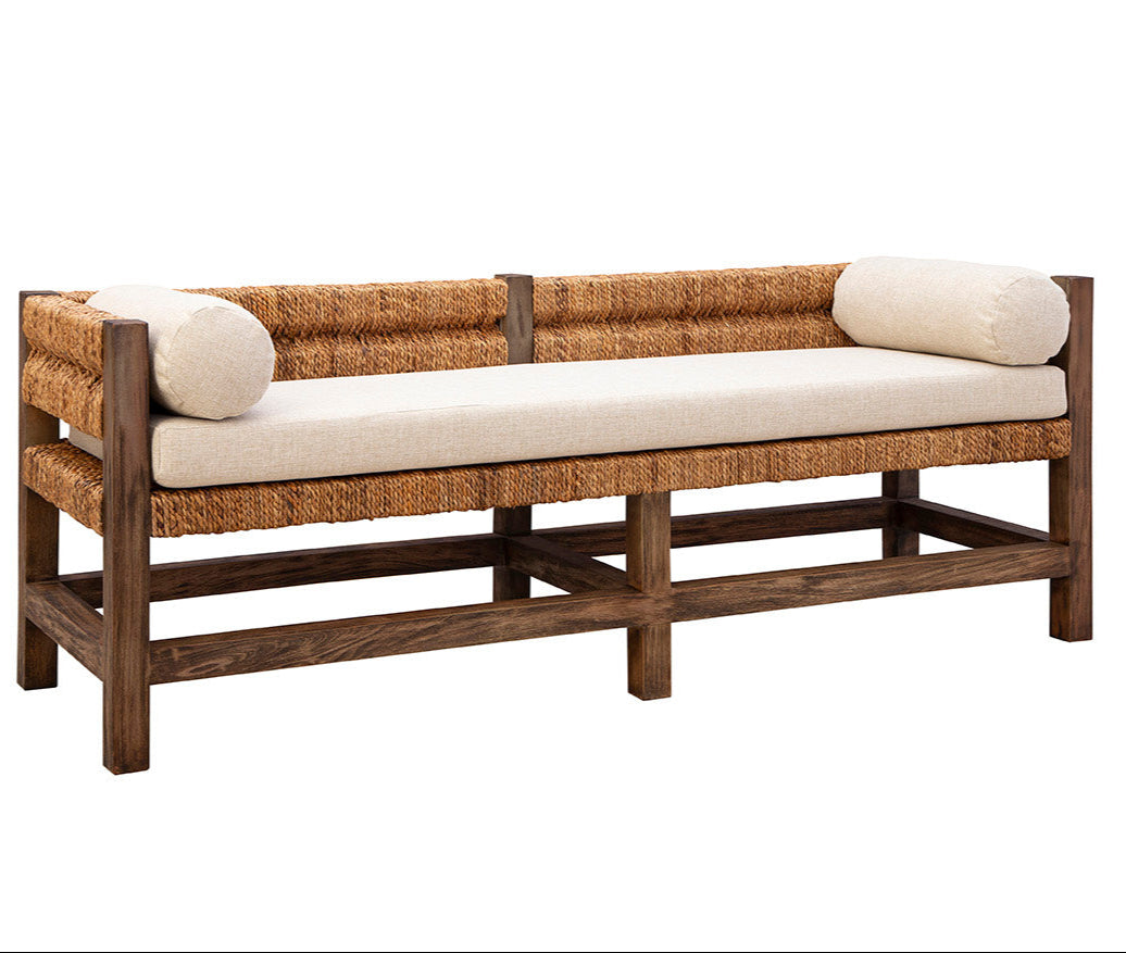 The Georgia Bedroom Bench combines natural materials with a touch of elegance, making it a perfect addition to any home seeking an organic feel. Created from sustainably grown mahogany, it offers durability and a rich, warm finish. The woven banana leaf seat and back add texture, providing a cozy and inviting atmosphere. This bench is topped with a performance linen blend cushion, ensuring both comfort and style. It fits seamlessly into spaces that embrace earthy and natural aesthetics, bringing a sense of calm and warmth.