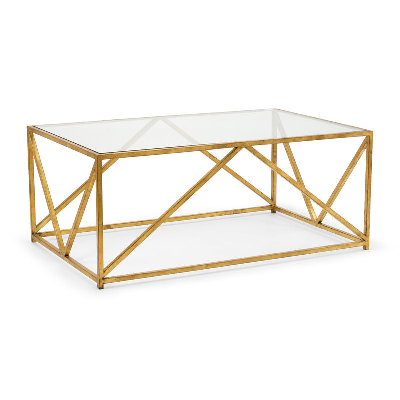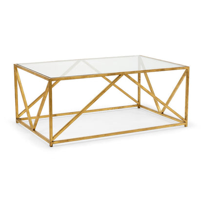 Enhance your living space with this beautifully crafted coffee table. The Glass Top Harlequin Coffee Table combines elegance and function, making it a standout piece in any room. Its rectangular glass tabletop offers a clear view of the intricate geometric design beneath. The table's gold metal frame adds a touch of luxury, reflecting light and creating a warm, inviting atmosphere. Designed by Jamie Merida, this coffee table is part of a distinguished collection known for its attention to detail and high-quality materials. The antique gold leaf finish adds a timeless appeal, while the sturdy iron construction ensures durability. Whether you're hosting guests or enjoying a quiet evening, this table is the perfect blend of style and practicality.