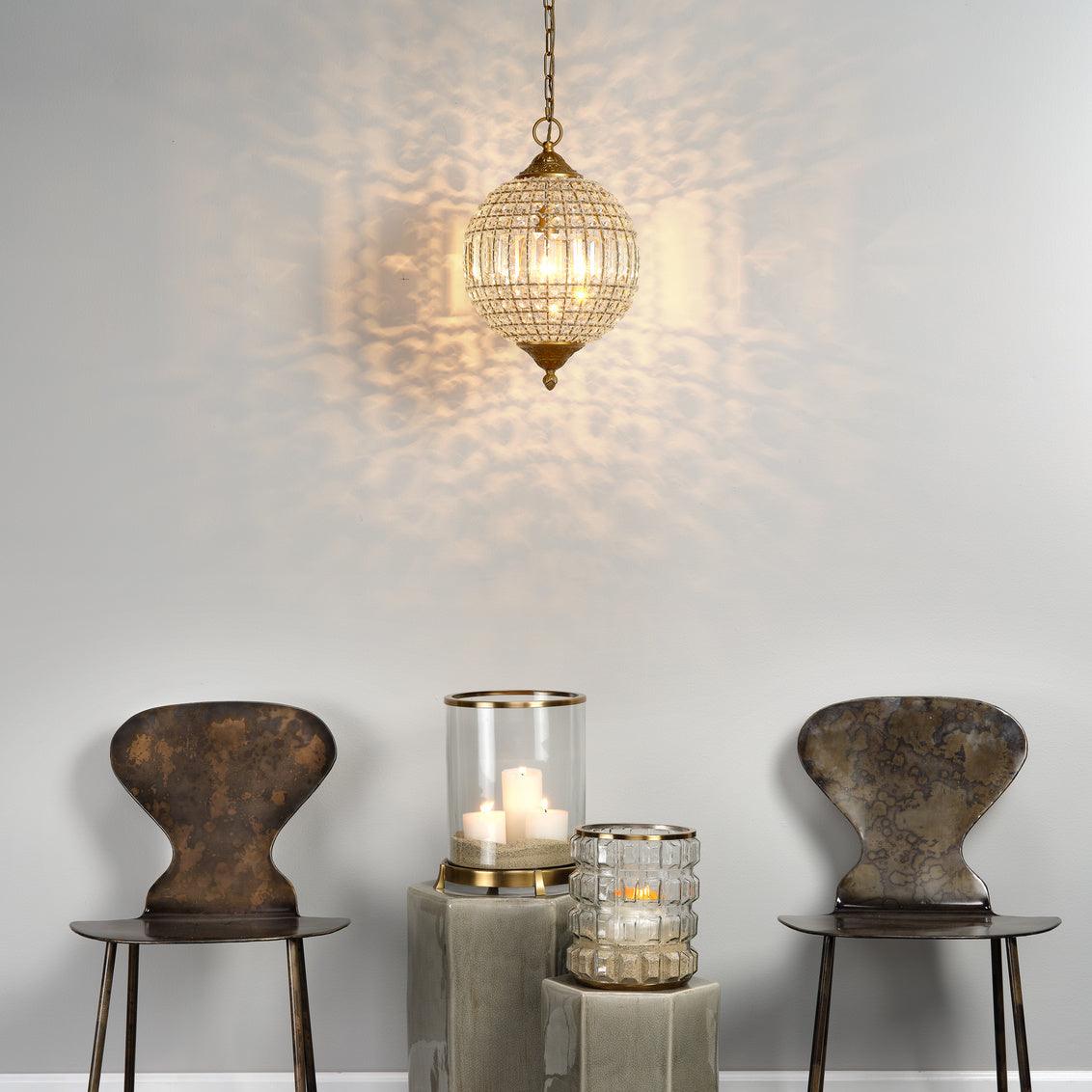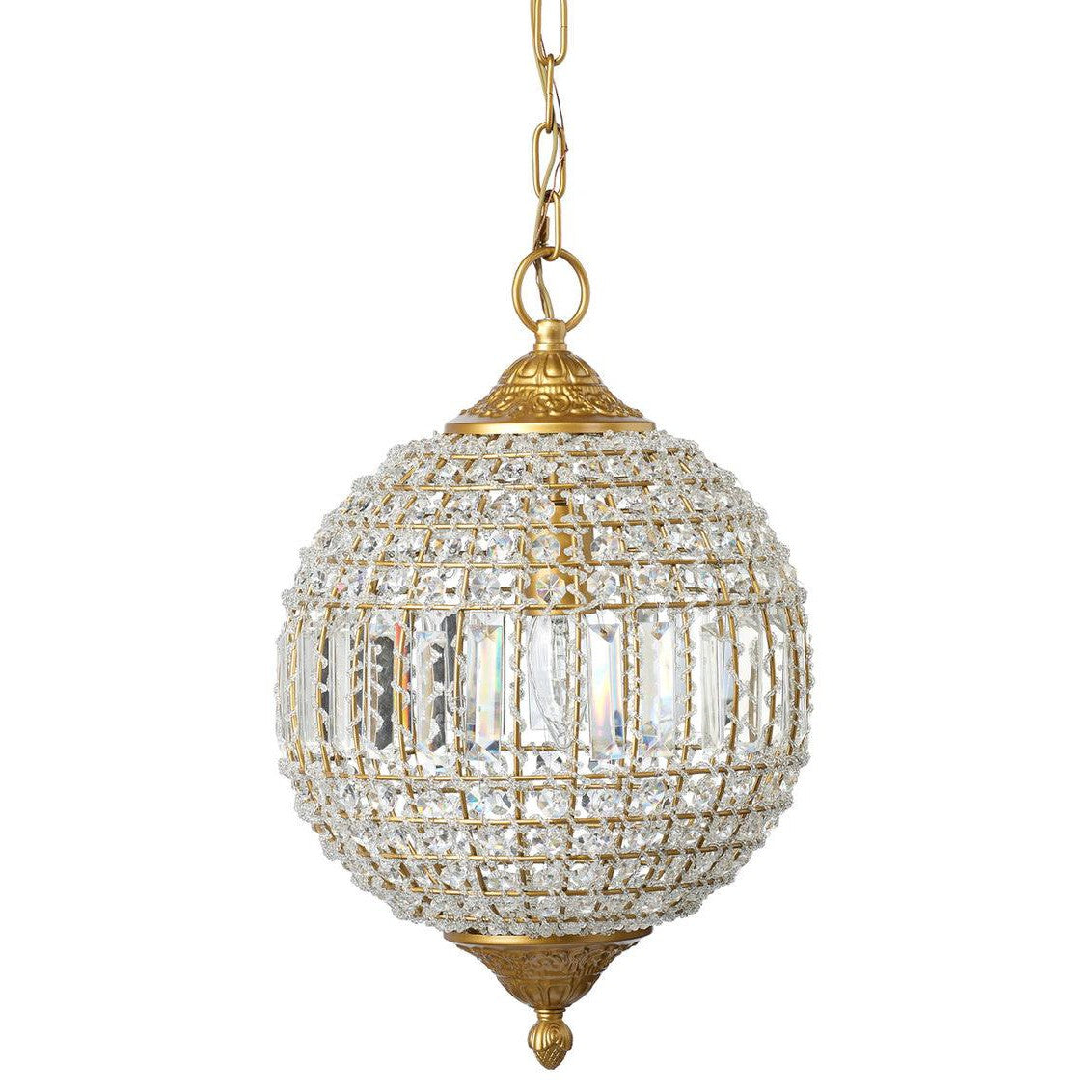 Elevate your space's elegance with our Golden Lighting Pendant Crystal Orb Pendant inspired by the elaborate mirrors of Versailles. The caged sphere adorned with sparkly crystals exudes a disco-ball effect and adds a touch of luxury to any area. It is recommended to have it professionally installed. Inspired by the ornate mirrors of Versailles, this captivating crystal orb pendant instantly elevates the sophistication of any room. Featuring a caged sphere adorned with hundreds of crystals in various sizes, and finely detailed finials, this fixture emits a mesmerizing disco-ball effect, casting fractal shapes on surrounding surfaces. Consider hanging it above a vanity, side table, dresser, or entryway. Suspended from a coordinating 8-foot antique gold chain, this pendant adds opulence and allure to your space.