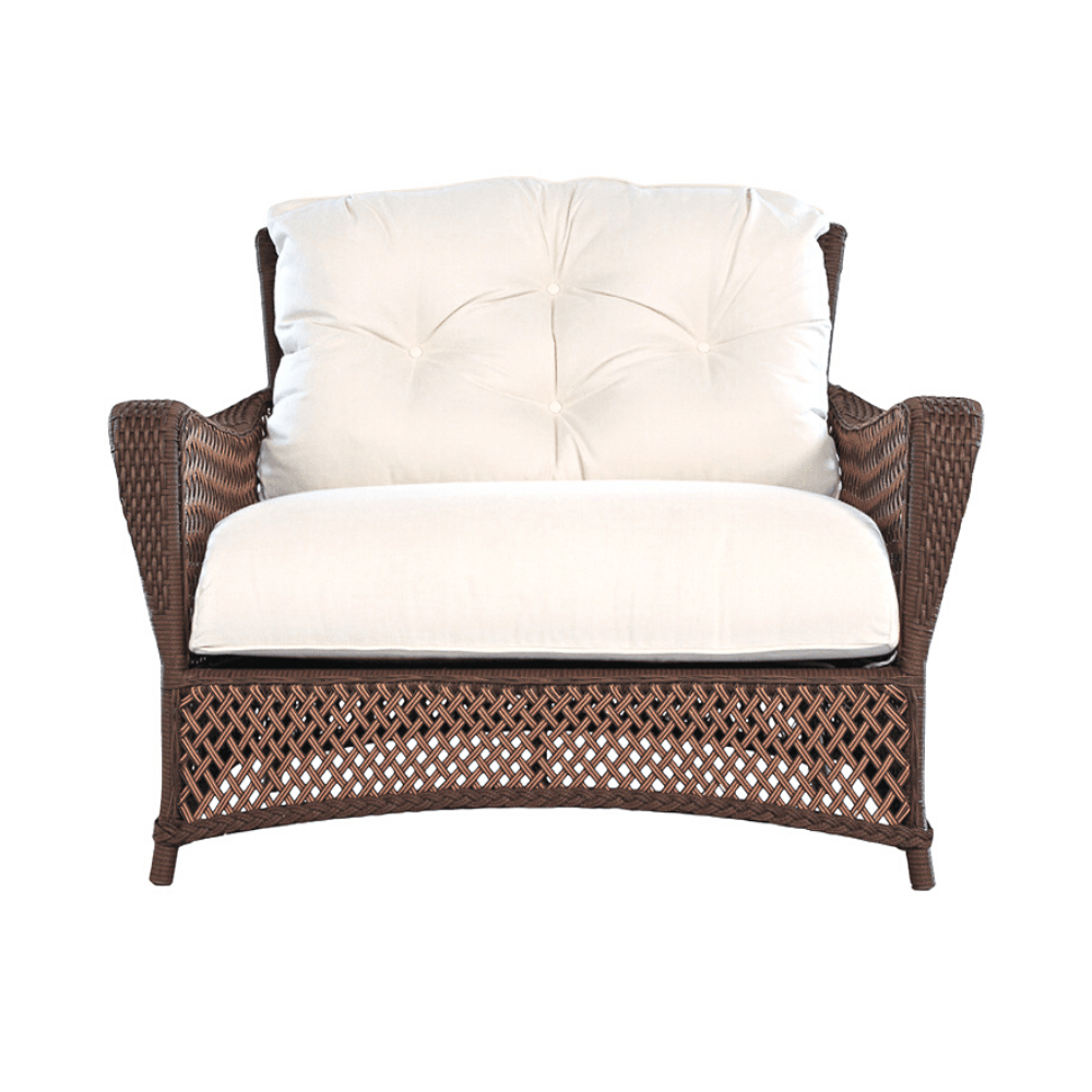 Crafted with expertise and practicality in mind, the Grand Traverse wicker collection from Lloyd Flanders transforms your outdoor space into a peaceful haven from the chaos of everyday life. Made with durable Sunloom vinyl, this collection guarantees long-lasting comfort and endless conversations. Whether on the lanai, sun room, or front lawn, the Grand Traverse collection offers versatility to fit any lifestyle and adapt to changing seasons. Available in two elegant wicker colors (Brown-Caramel or Ivory-Bisque) and a wide range of outdoor fabric choices, the wicker is resistant to cracking and peeling and can be customized to fit your personal style. Create your ideal patio furniture set by pairing rust-resistant wicker finishes with fade-resistant, mildew-resistant, and water-repellent fabrics. With exceptional seating comfort, built-in resistance to mildew and bacteria, and eco-friendly materials, each piece is designed to provide timeless American charm.