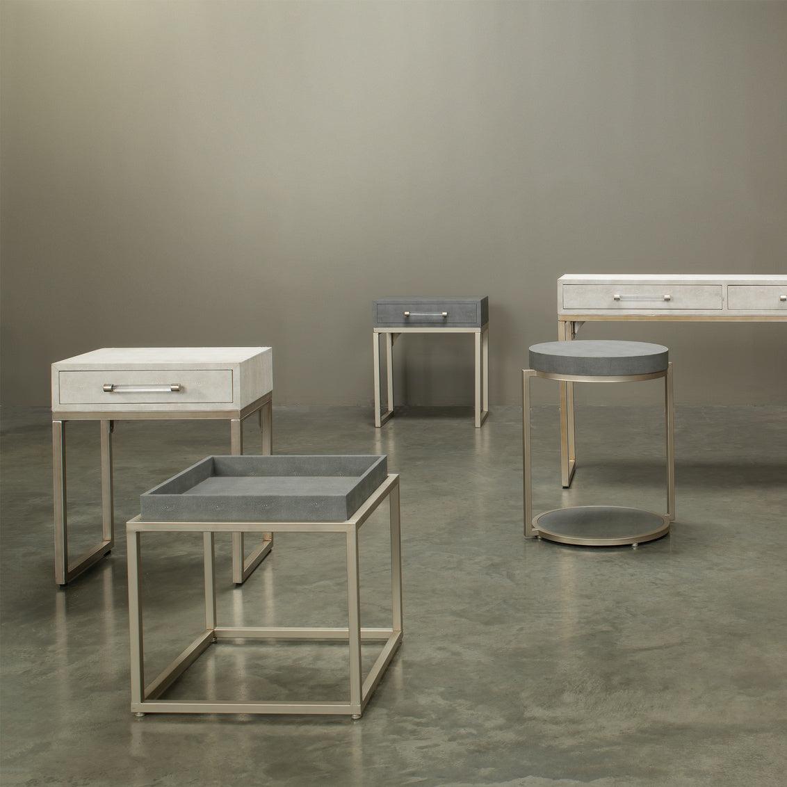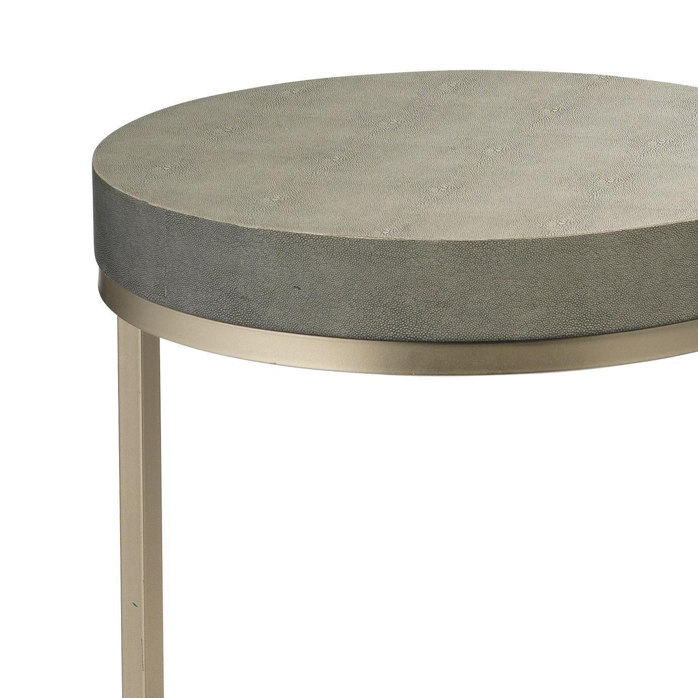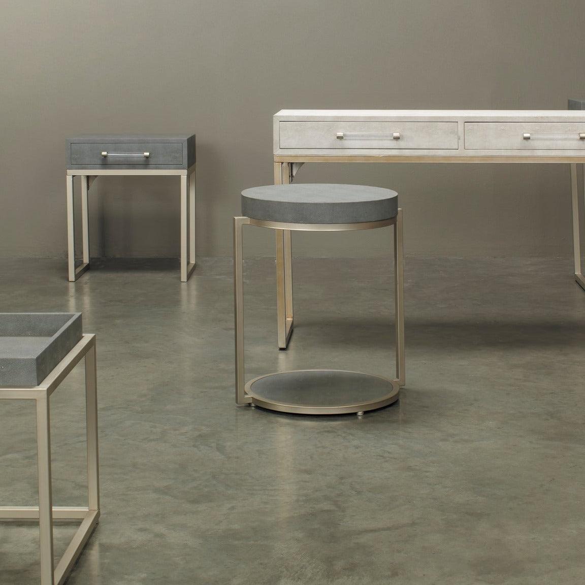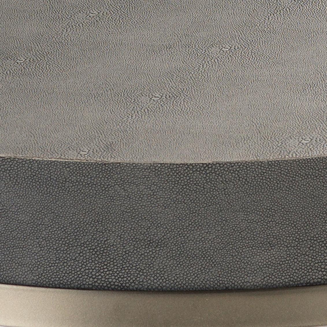 Discover timeless elegance with our Grey Leather Round Mid Century Modern Side Table. The top and shelf are upholstered in grey faux shagreen, giving it a luxurious texture. The nickel plated steel base adds durability and sophistication to this stylish and functional side table. Add a touch of sophistication to your living space with this exquisite piece, featuring the exotic and modern texture of stingray skin since the 1930s. The top and shelf have been expertly upholstered in grey faux shagreen and set in a nickel plated steel base to provide a luxurious and long-lasting look. Elevate your living space with this stunning and versatile piece of furniture that effortlessly combines style and functionality.