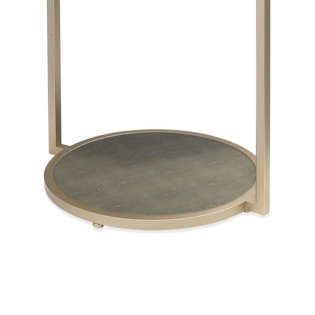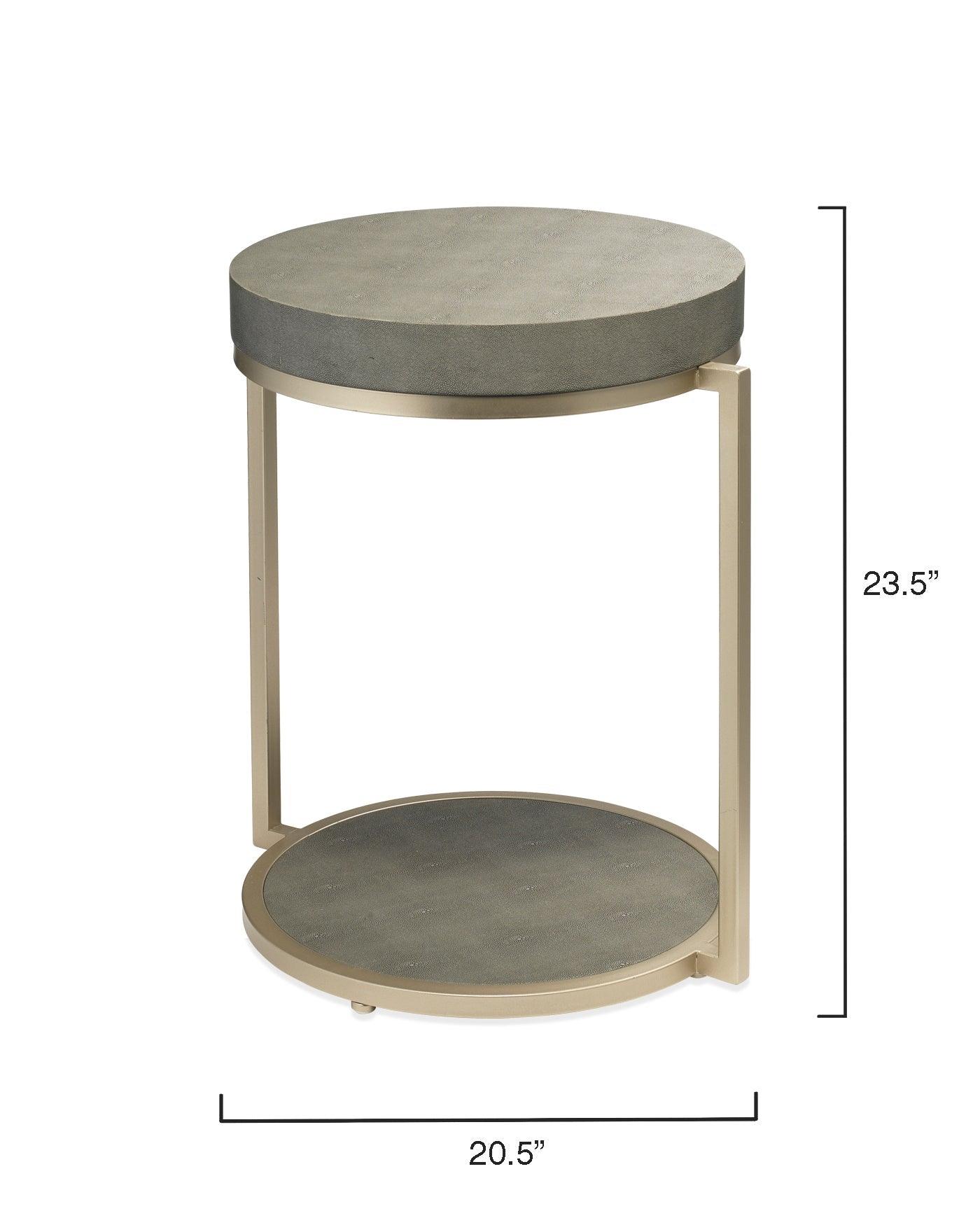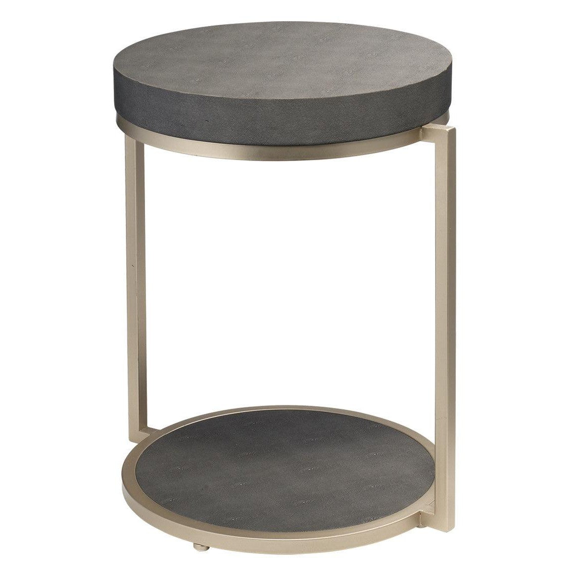 Grey Leather Round Mid Century Modern Side Table With Shelf Features:
