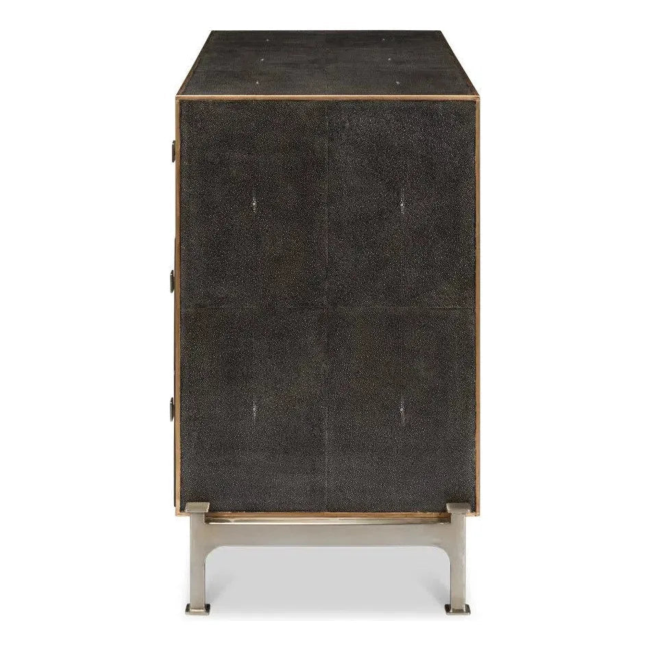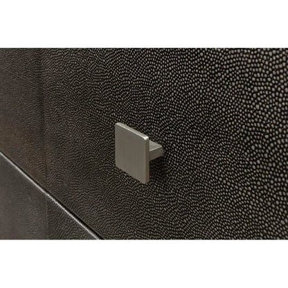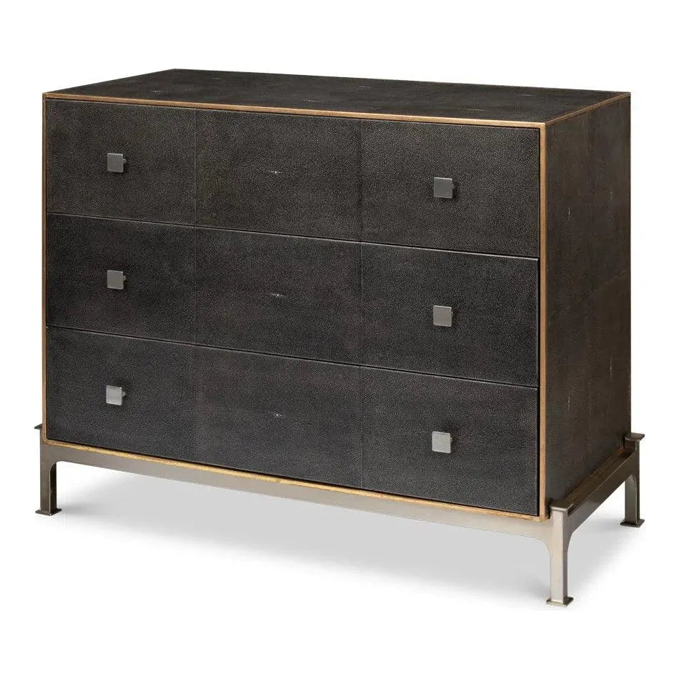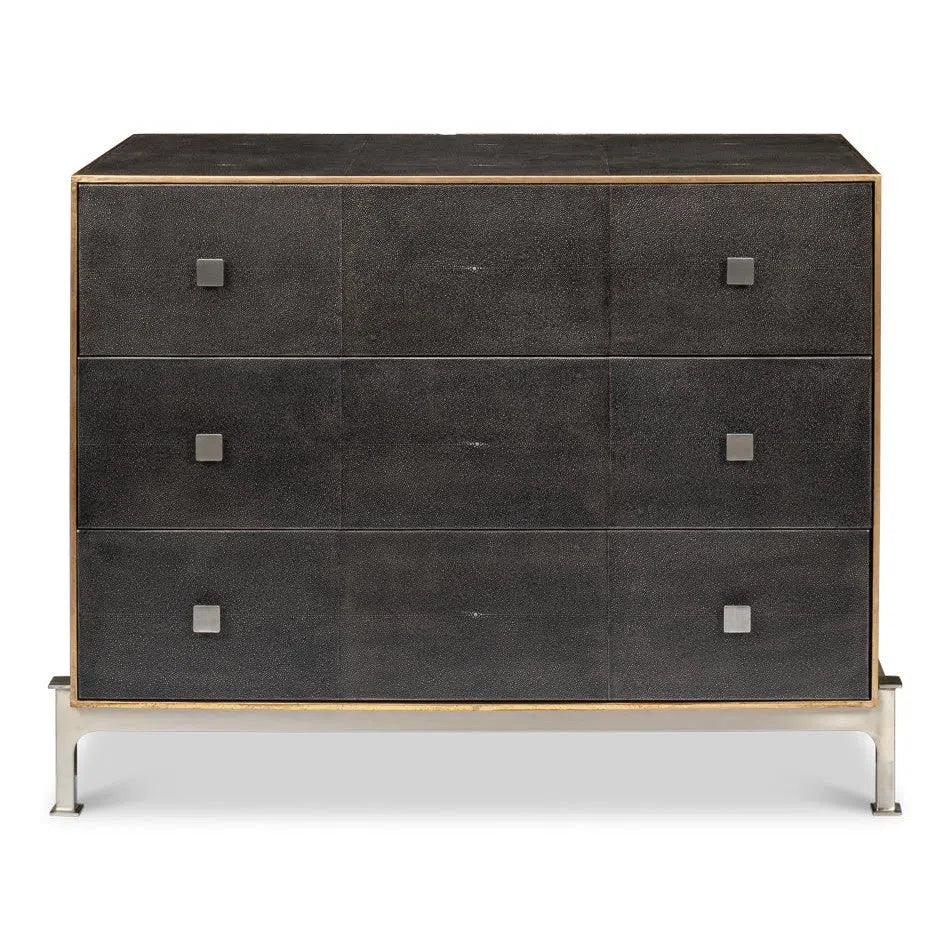Grey Shagreen Dresser, Infuse contemporary bedrooms and dressing spaces with textural intrigue and understated elegance using this exquisitely unique Grey Shagreen Dresser. Three drawers fronted with ostrich Leather shagreen in a handsome weathered grey finish provide ample clothing storage and visual richness. Lined in marbled paper, the drawers open and close with hand-cast antique iron hardware. An iron frame with matching grey finish and hairpin legs completes the modern industrial style. Keep personal items organized in creative fashion with this dresser!