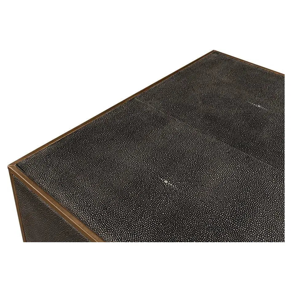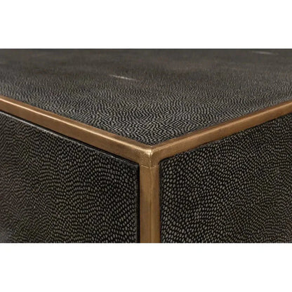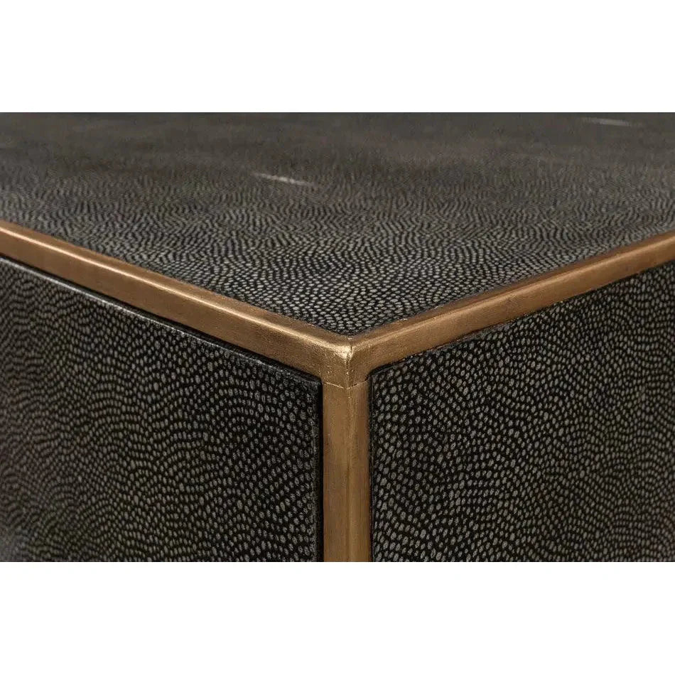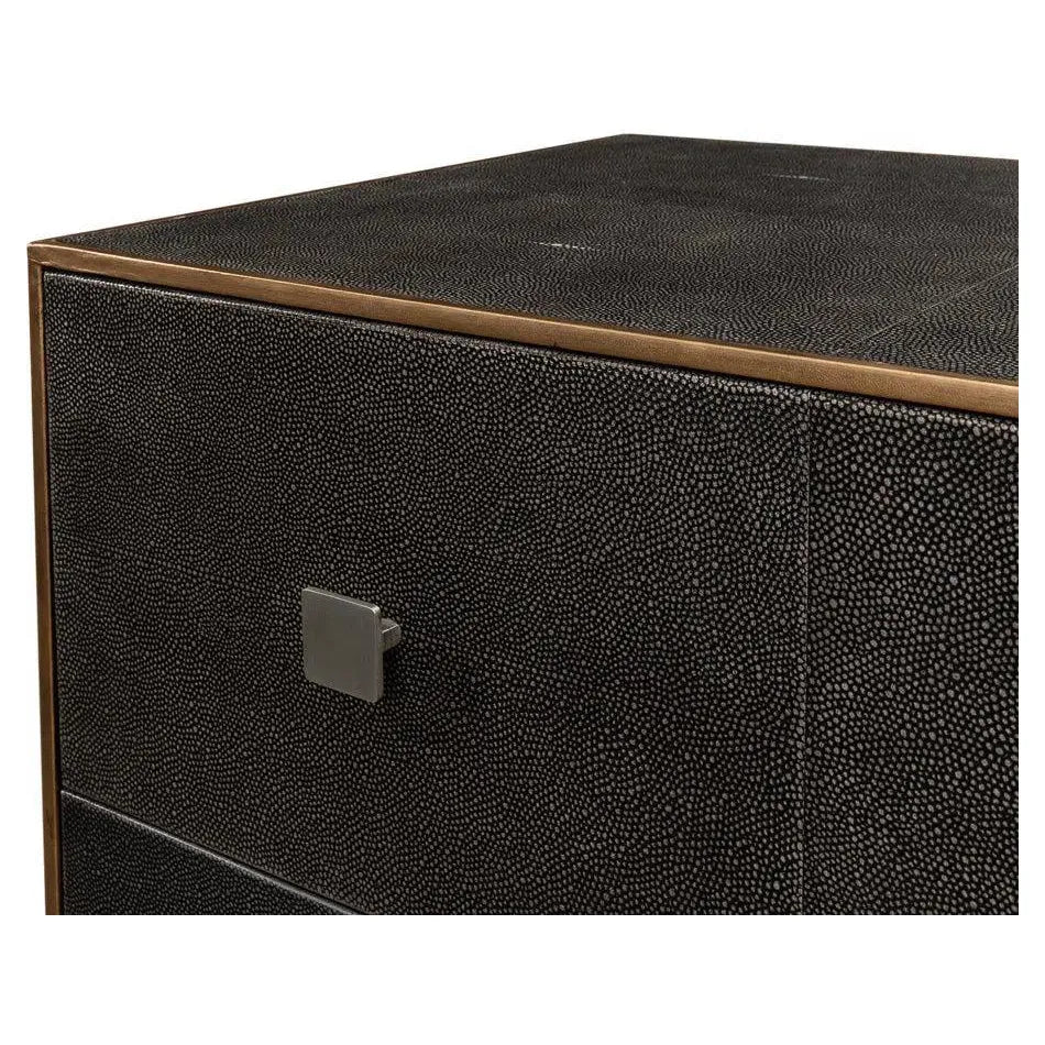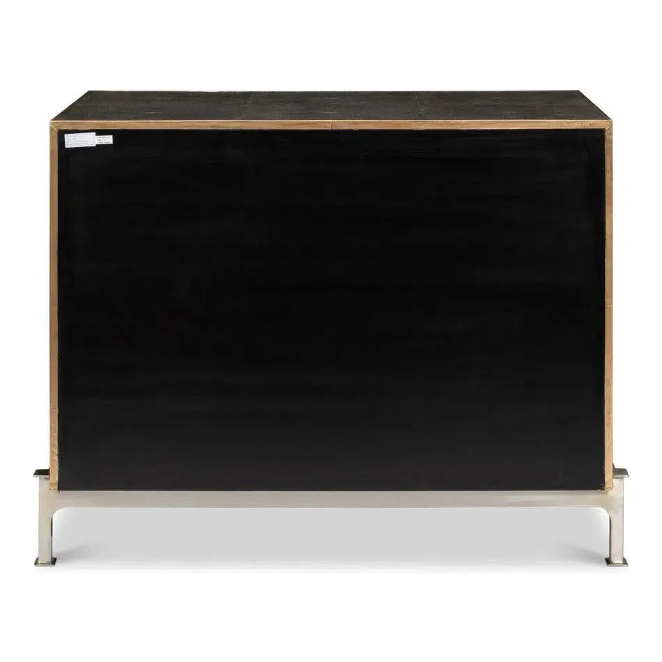 Grey Shagreen Dresser, Infuse contemporary bedrooms and dressing spaces with textural intrigue and understated elegance using this exquisitely unique Grey Shagreen Dresser. Three drawers fronted with ostrich Leather shagreen in a handsome weathered grey finish provide ample clothing storage and visual richness. Lined in marbled paper, the drawers open and close with hand-cast antique iron hardware. An iron frame with matching grey finish and hairpin legs completes the modern industrial style. Keep personal items organized in creative fashion with this dresser!