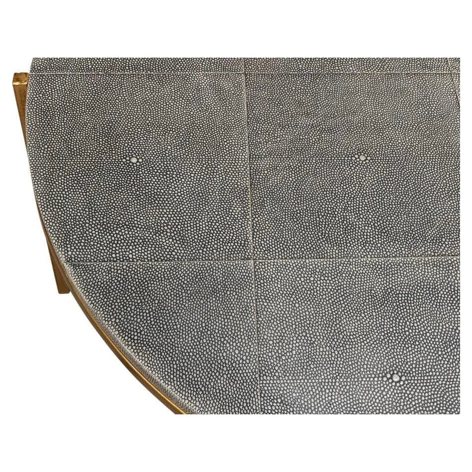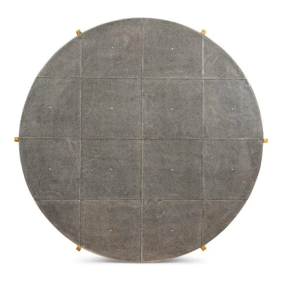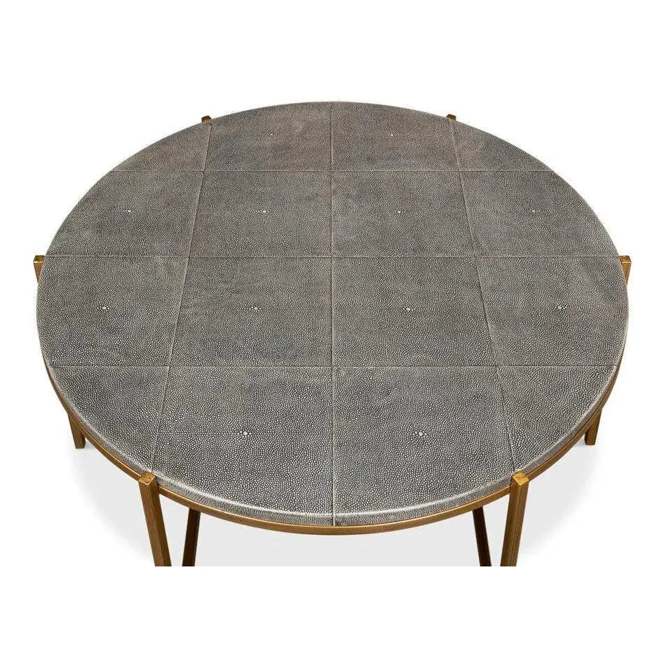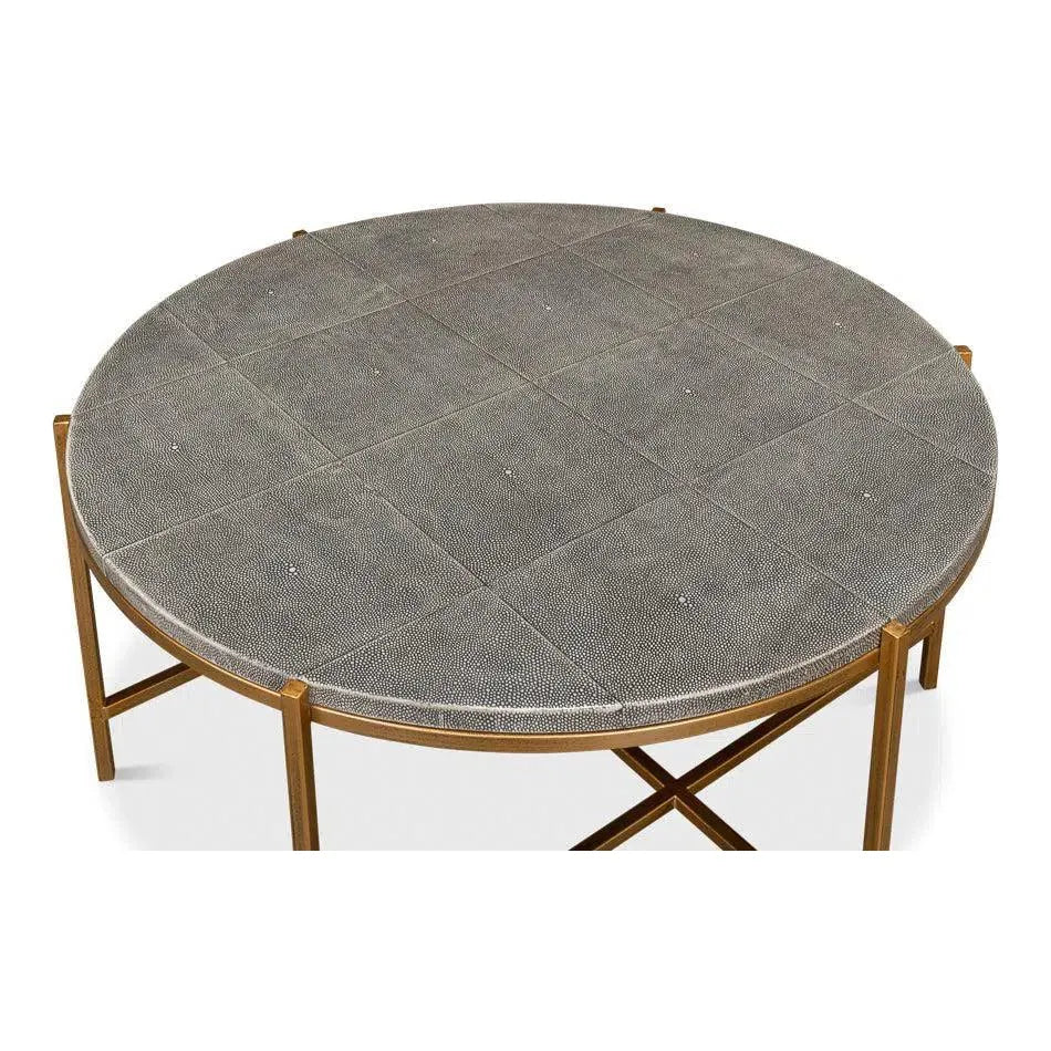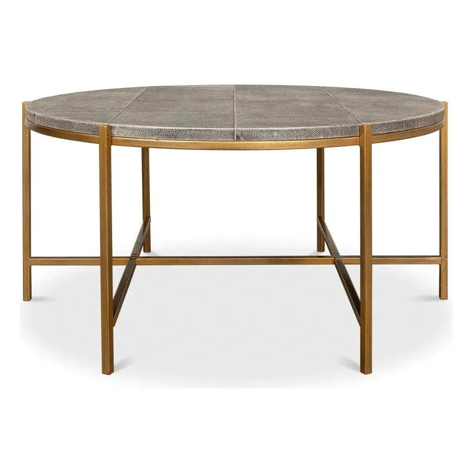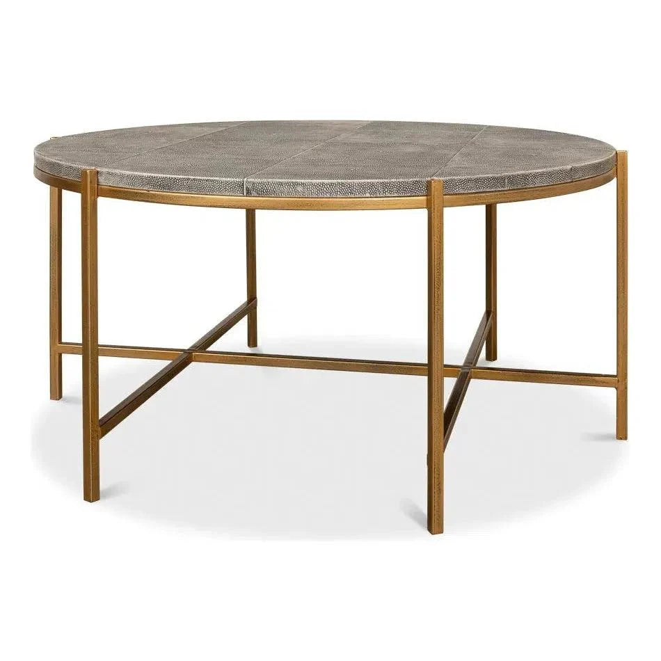 Introduce a touch of organic elegance and industrial edge to your living room with the Grey Shagreen Leather Round Coffee Table. Skillfully crafted with careful attention to detail, this luxurious coffee table features a 34 inch round tabletop adorned in exotic grey shagreen for a unique and captivating texture. Complementing the tabletop is a striking antiqued brass iron base, creating a show-stopping centerpiece that adds a touch of contrast to any space.