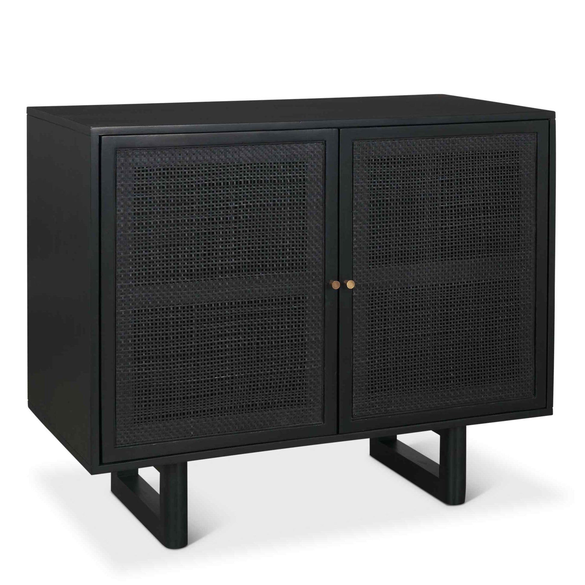 Crafted from solid mango wood, the Grier Accent Cabinet brings a bold black finish to any room. Its smooth matte black surface adds a touch of contemporary flair, while the cane lattice fronts on the two doors introduce a natural texture. This unique blend of materials creates an organic coastal appeal, making it perfect for modern homes. The cabinet features elegant solid brass knobs, enhancing its sophisticated look. Ideal for living rooms, bedrooms, or entryways, the Grier Cabinet offers stylish storage solutions that elevate your space with a relaxed yet refined aesthetic.