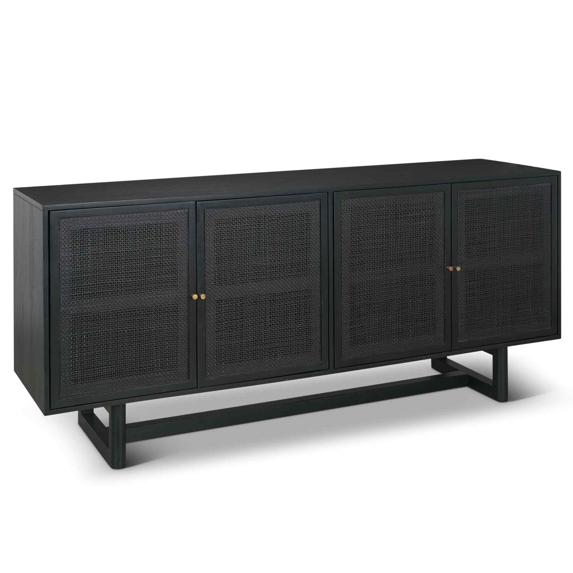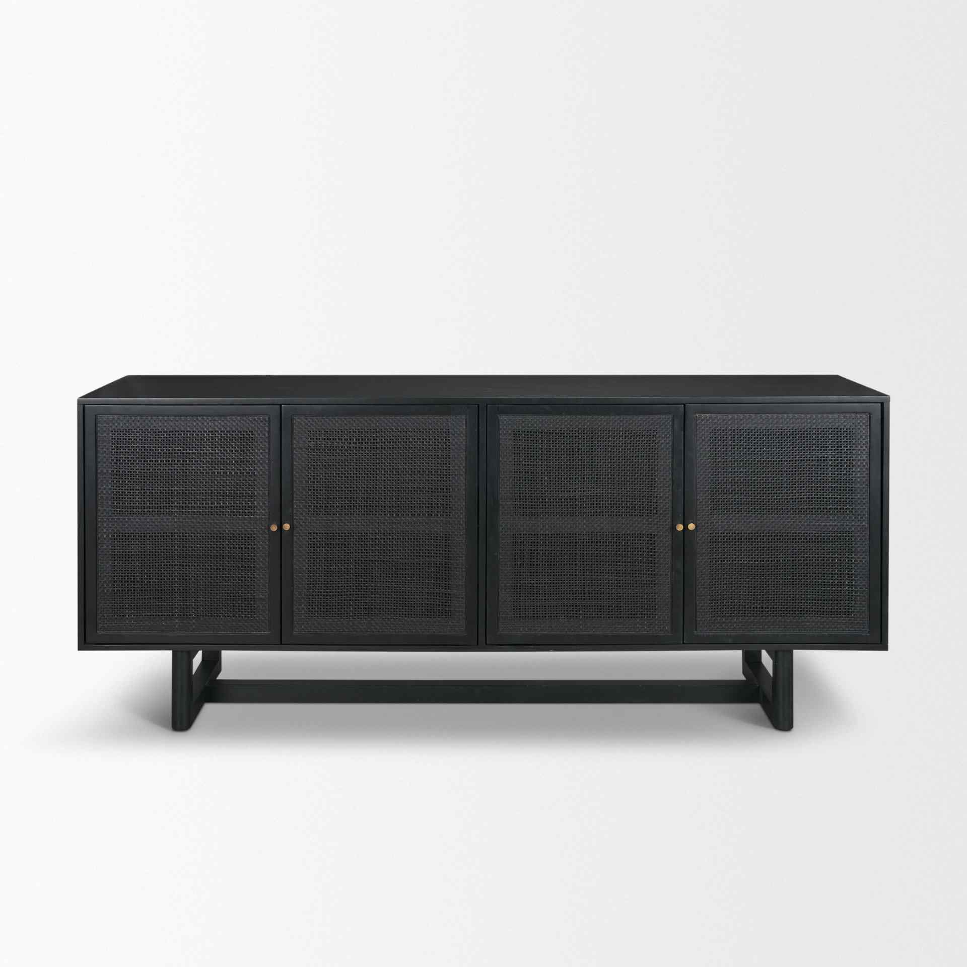 The sideboard brings together matte black wood and natural cane, creating a modern yet organic style. Its smooth, matte black finish offers a bold contrast, while the natural cane adds texture, making it a standout piece in any room. Crafted from mango wood and cane, it features solid brass knobs for a touch of elegance. This sideboard is versatile, providing extra storage space, and fits well in dining rooms, living rooms, or other open areas. Its relaxed yet elevated design is perfect for those seeking both style and function in their furniture.