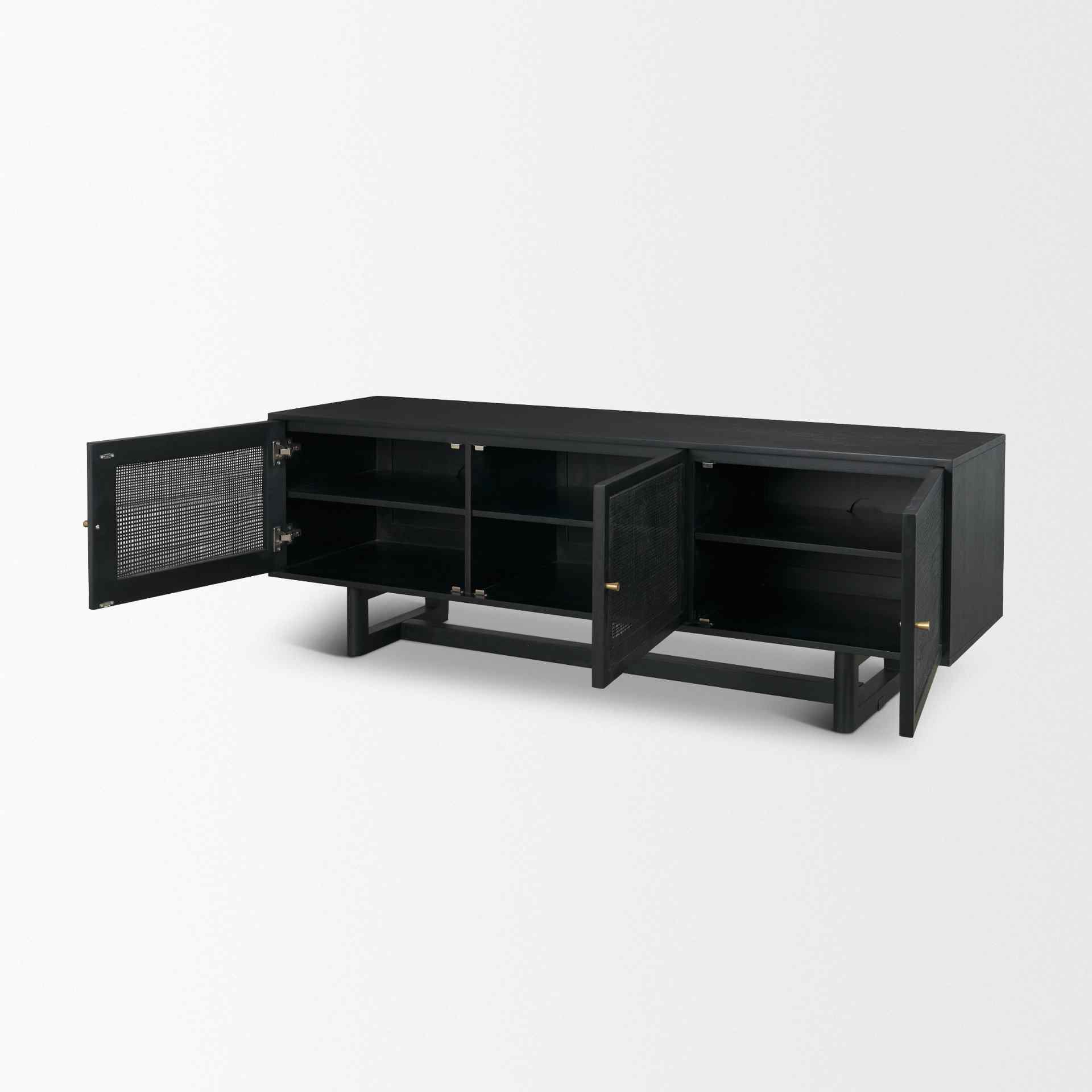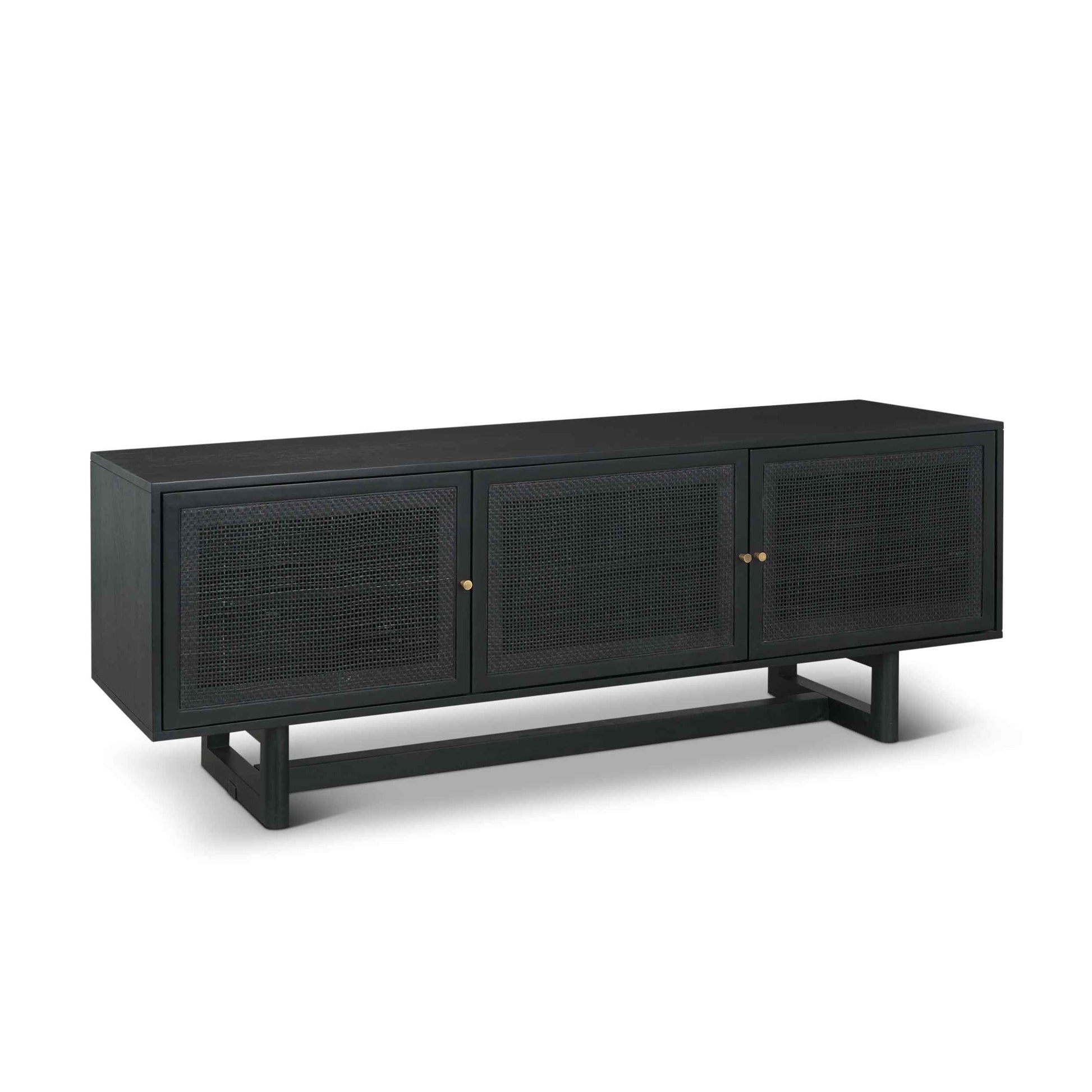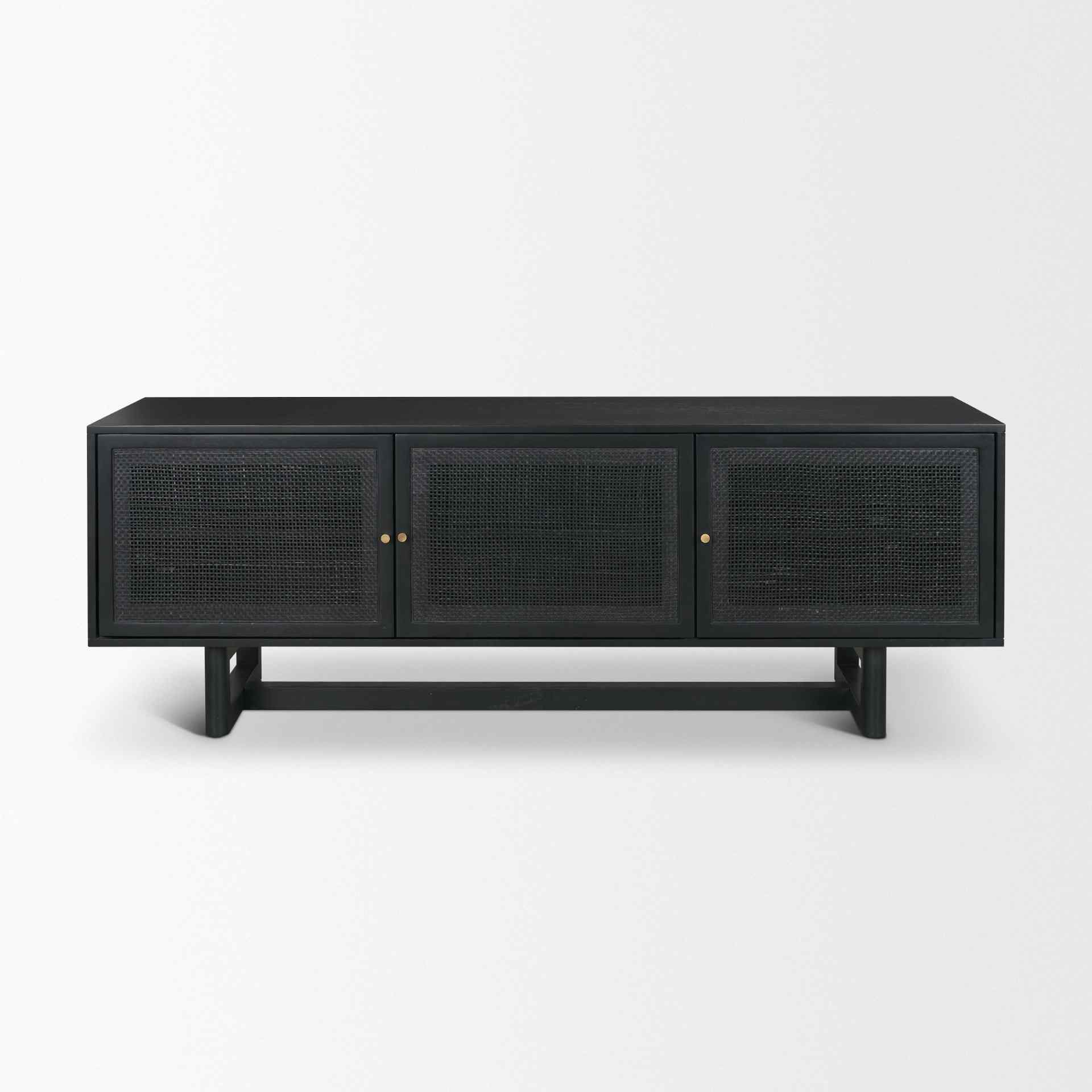 Offering a blend of modern and organic style, this media console is crafted from matte black, light brown and medium brown wood with cane. It brings a relaxed yet stylish look to any entertainment space, thanks to its smooth finish. The combination of solid wood and natural cane creates a unique texture that stands out. Its sleek brass knobs add a touch of elegance. With plenty of storage space, it is perfect for organizing media essentials. This piece is not just functional; it also serves as a decorative element, making it a great addition to any room. Elevate your home decor with this versatile console.