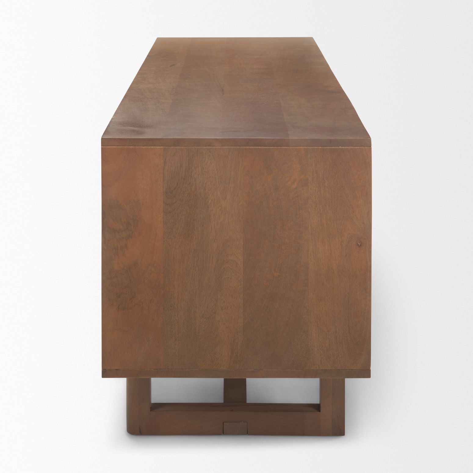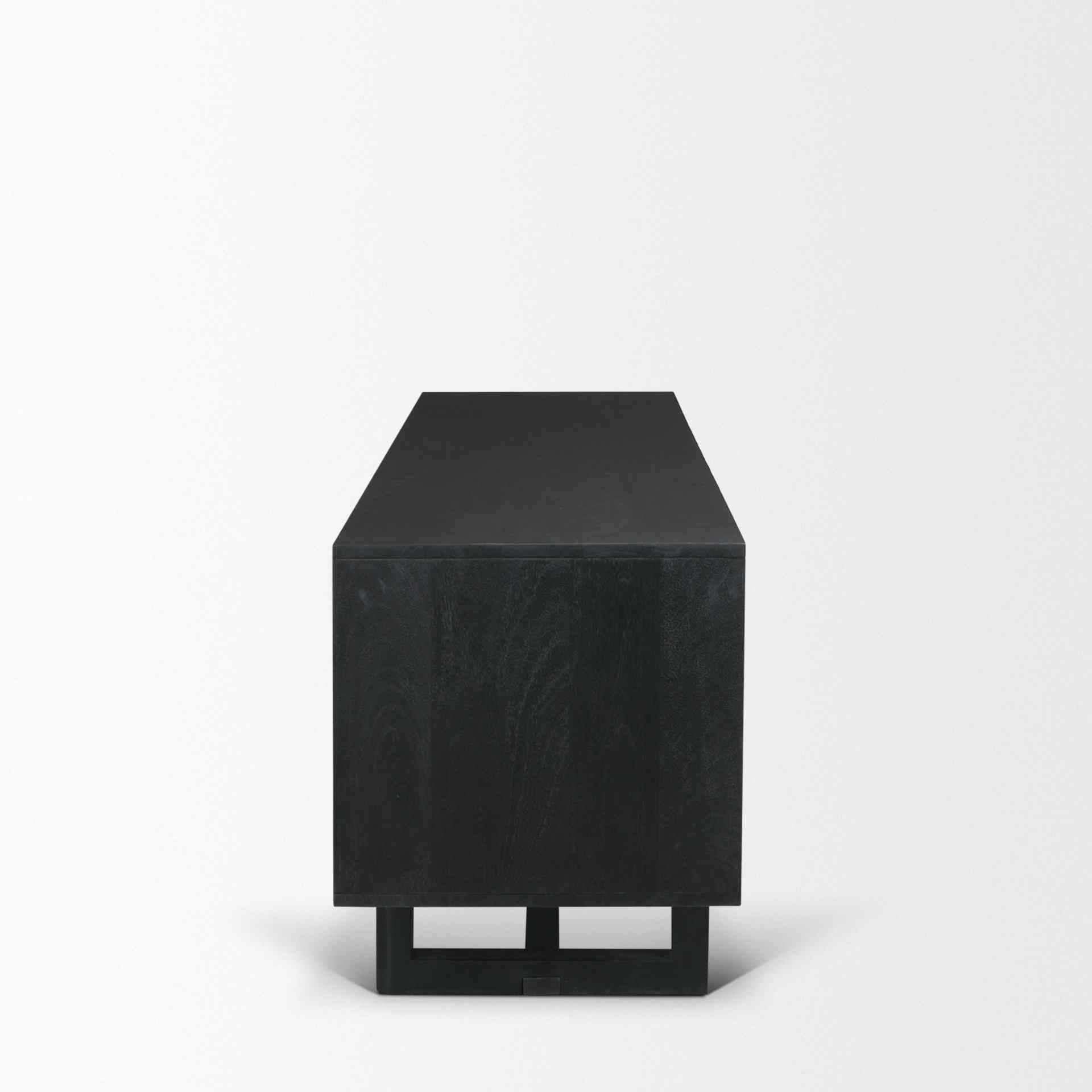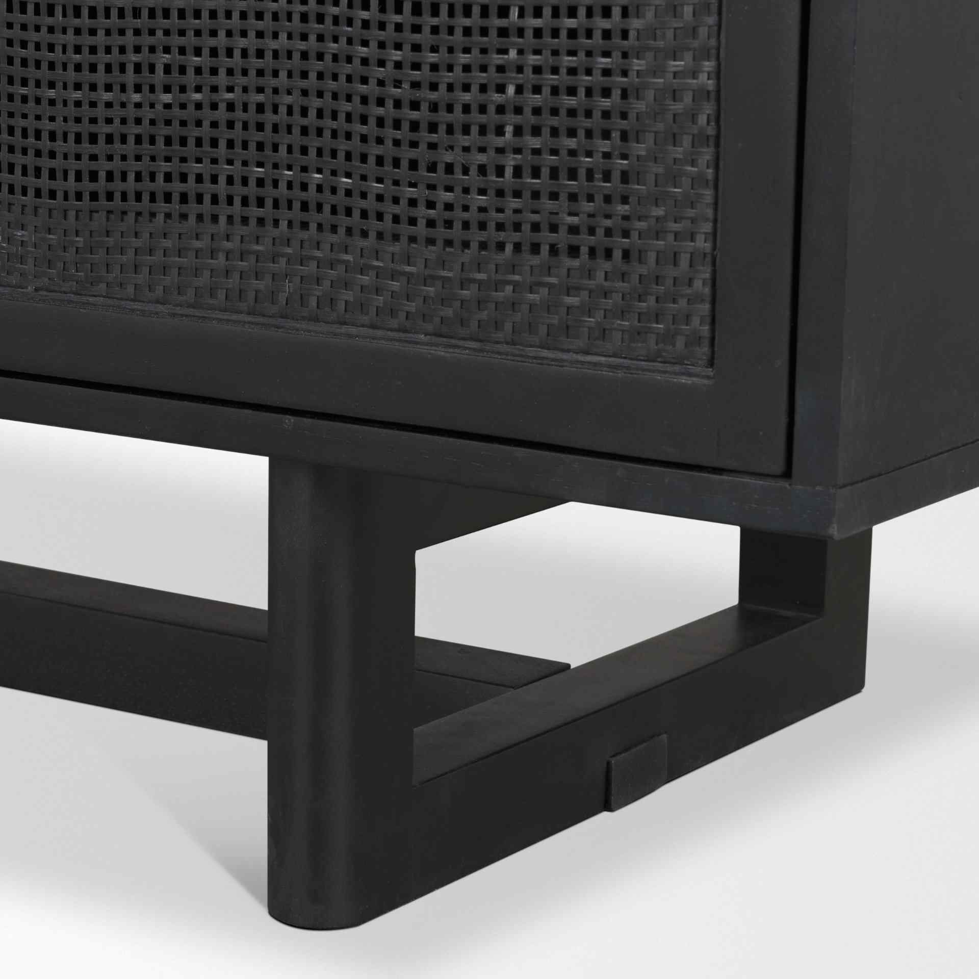 Offering a blend of modern and organic style, this media console is crafted from matte black, light brown and medium brown wood with cane. It brings a relaxed yet stylish look to any entertainment space, thanks to its smooth finish. The combination of solid wood and natural cane creates a unique texture that stands out. Its sleek brass knobs add a touch of elegance. With plenty of storage space, it is perfect for organizing media essentials. This piece is not just functional; it also serves as a decorative element, making it a great addition to any room. Elevate your home decor with this versatile console.