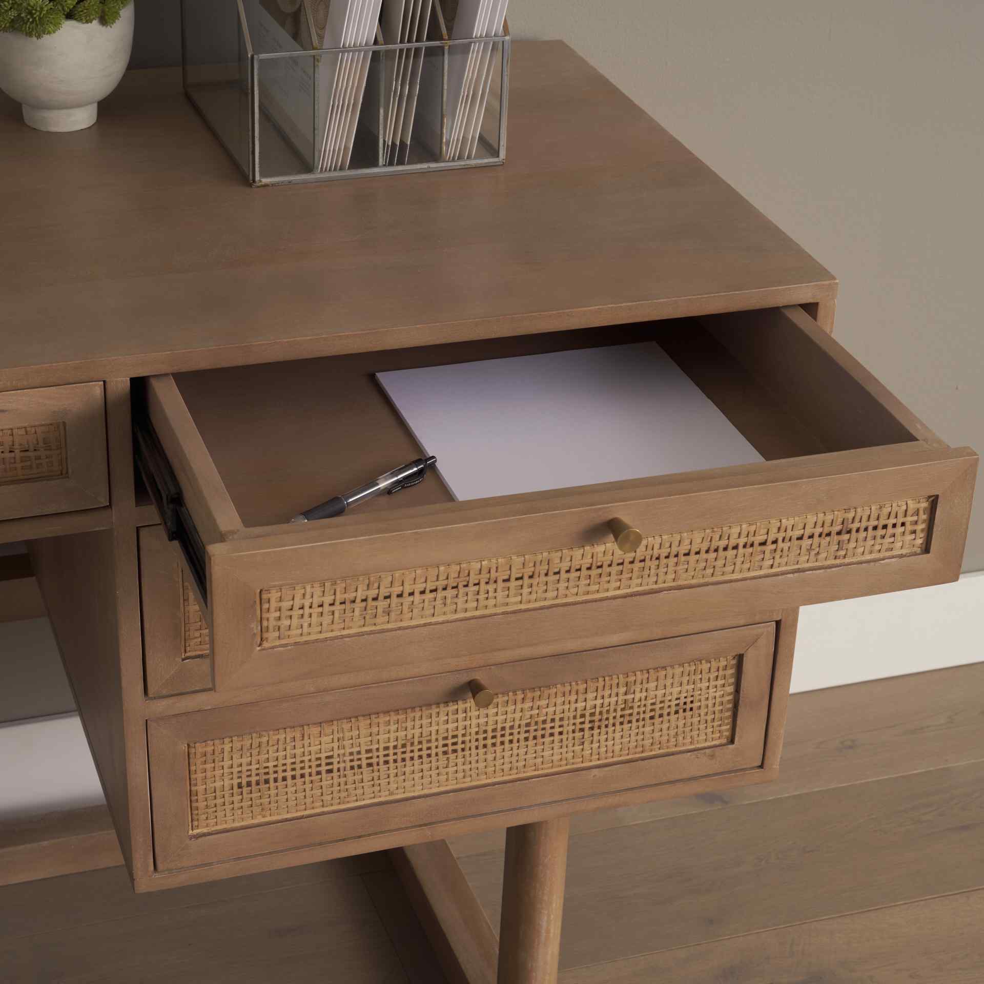 The Grier Light Brown Wooden Office Desk is designed to enhance any workspace with its sleek and sophisticated look. Crafted from solid Mango wood, it features elegant cane details that add a touch of natural beauty. This desk not only brings a sense of airiness to the room but also offers a relaxed sophistication that fits perfectly in contemporary settings. Its minimalist design and neutral color make it an ideal choice for those looking to combine style with functionality.