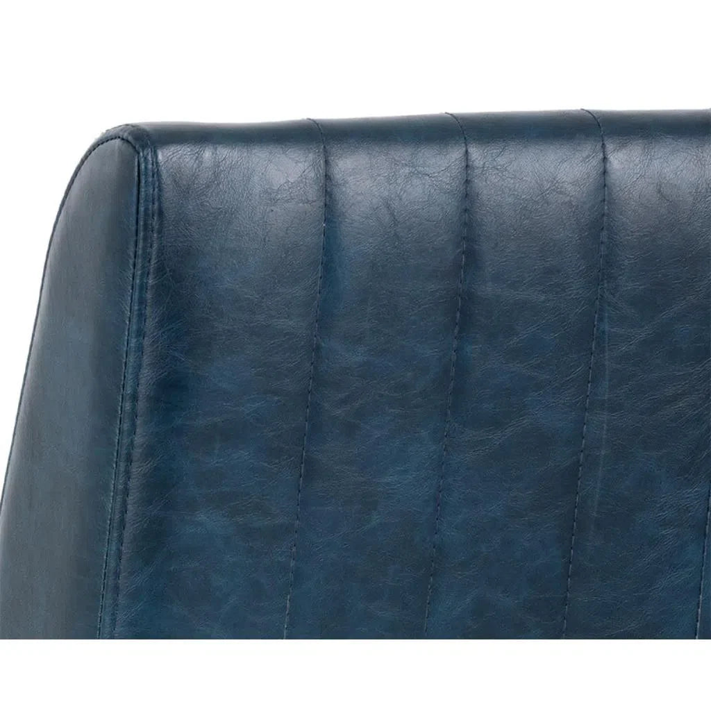 An urban designed stool featuring bold vertical channel tufting on the seat and back, available in Bravo Cream, Bravo Metal, Vintage Black, Vintage Blue, and Vintage Cognac faux leather. Finished with a rustic bronze steel frame and stretchers. Great for residential and commercial placements. Suitable for various dining, kitchen, and bar spaces of all sizes. Handle With Care: This design has been crafted with faux leather. Faux leather is manufactured to reflect the natural characteristics of leather; as such, color variations, markings, wrinkles, grooves, and light scratches are appreciated characteristics. No two pieces will be alike. Visit our Product Care page for more information on how to ensure the lasting beauty of this piece.