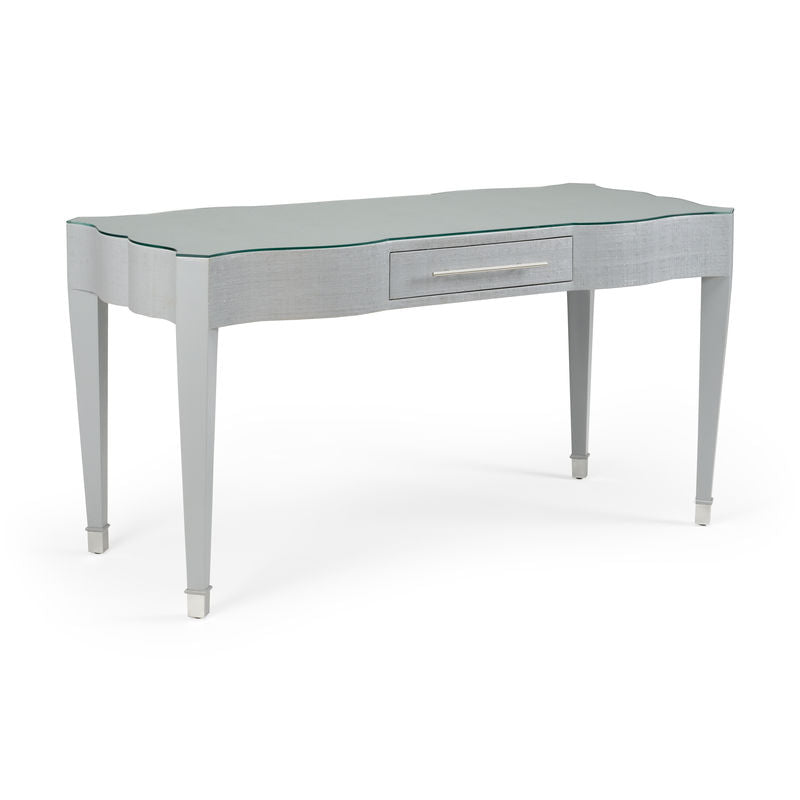 The Harlee Desk offers a timeless design that blends classic style with modern functionality. This desk is sheathed in Grey painted raffia, providing a textured finish that adds a touch of sophistication to any workspace. Its elegant silhouette is complemented by wavy edges and tapered legs, creating a minimalist aesthetic that fits seamlessly into both traditional and contemporary settings. The tempered glass top not only adds a layer of protection but also enhances the desk's overall elegance, making it a perfect centerpiece for your office or study. Functionality meets style with Harlee's practical features. The desk includes a single storage drawer, lined with felt, which is ideal for organizing office essentials.